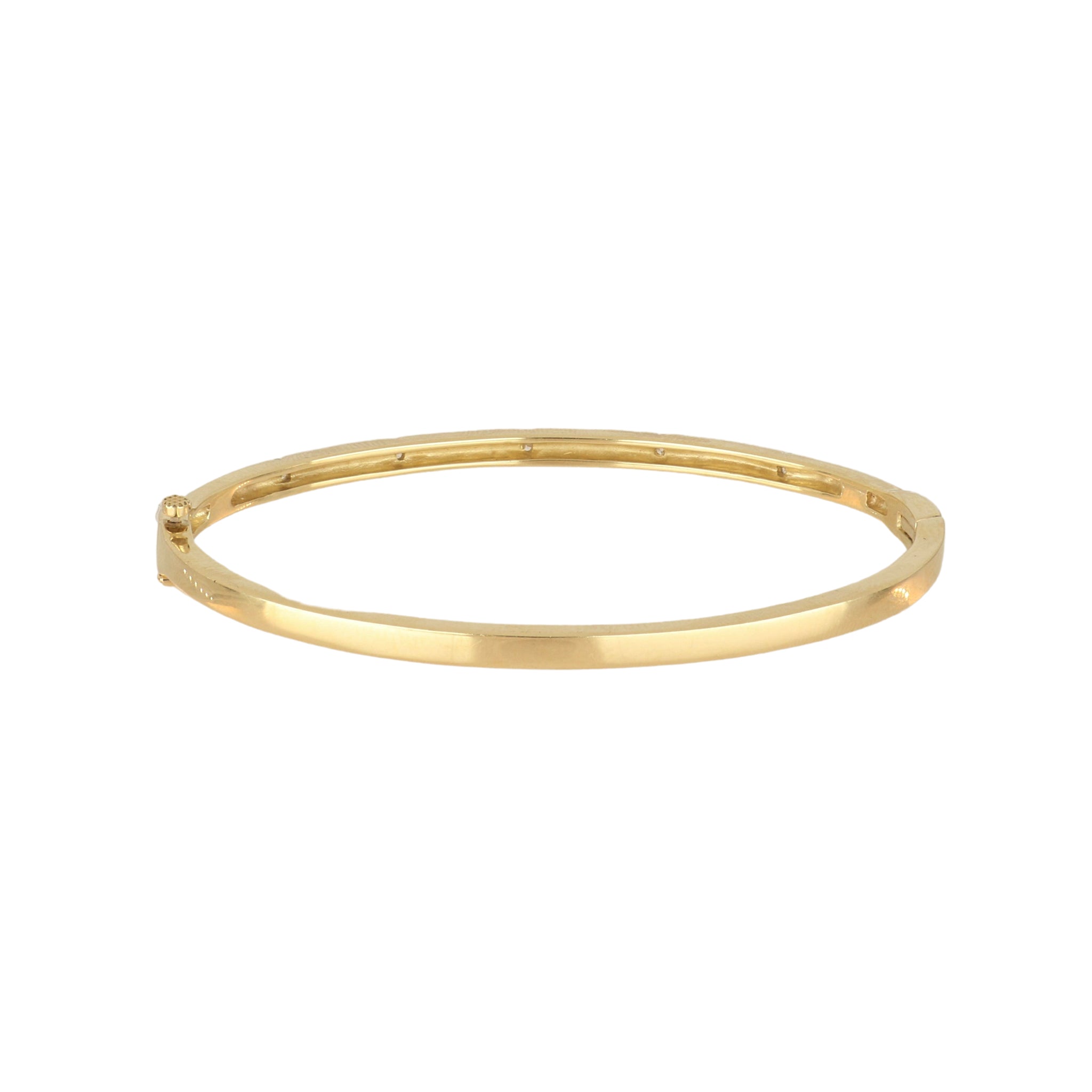 A 14K yellow gold hinged bangle bracelet with diamonds.