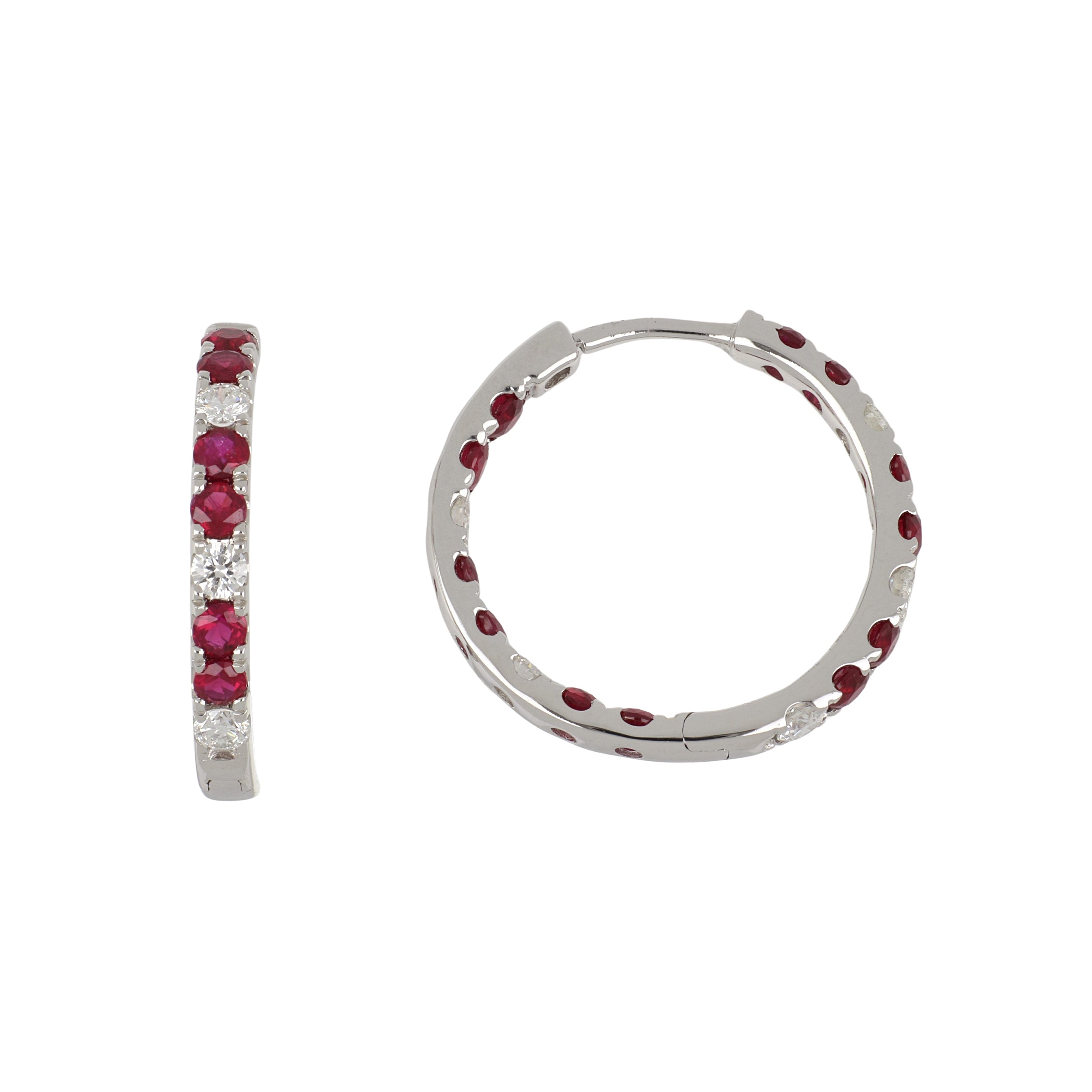 14K White Gold Ruby Hoop Earrings with Diamonds