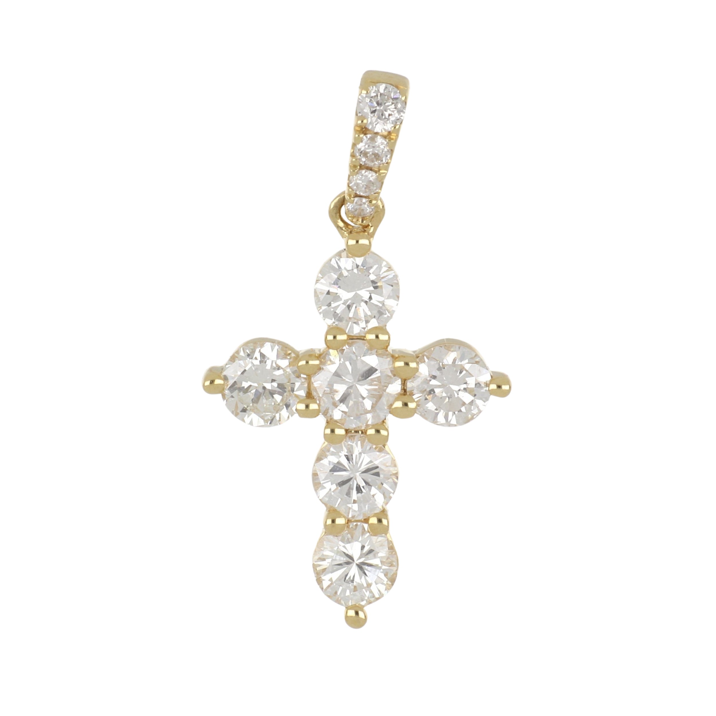 A diamond cross pendant with a diamond bail, set in 18K yellow gold.