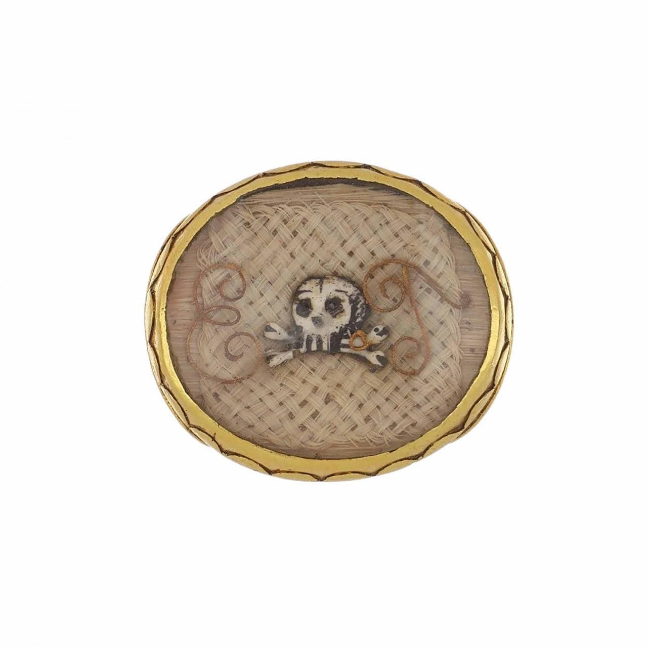 An antique Stuart crystal slide (sealed) in 18K yellow gold, for mourning, with pale blonde woven hair background, gold wire ciphers (e.t.) skull & cross bones under a faceted flat-topped cap of carved rock crystal quartz. Queen Anne period, circa 1700.