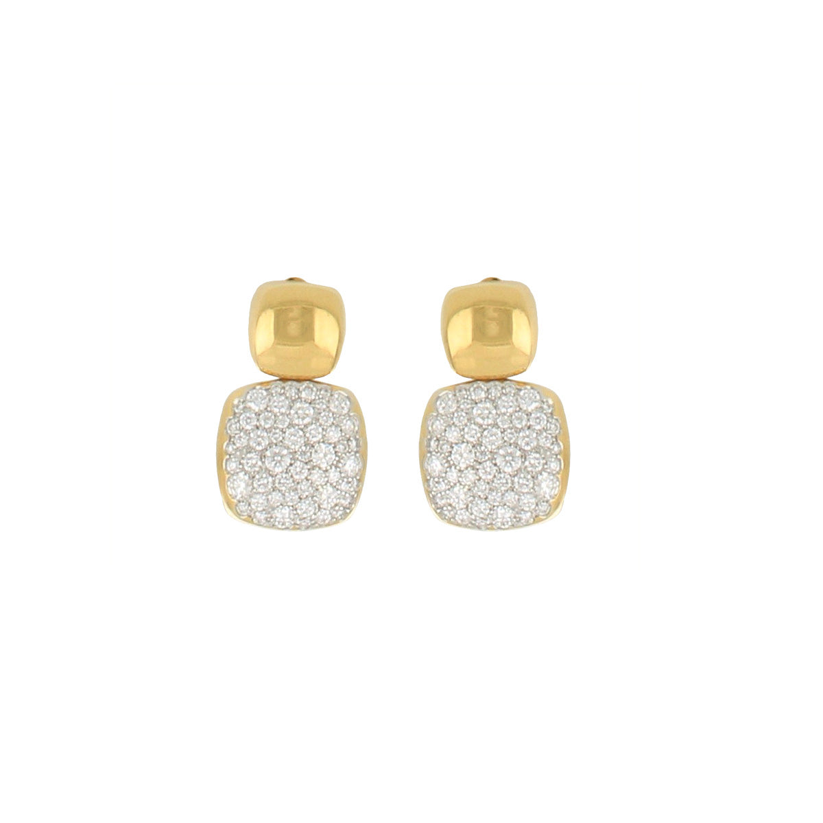 A pair of Antonio Papini 18K yellow gold cushion-shape earrings with diamonds.