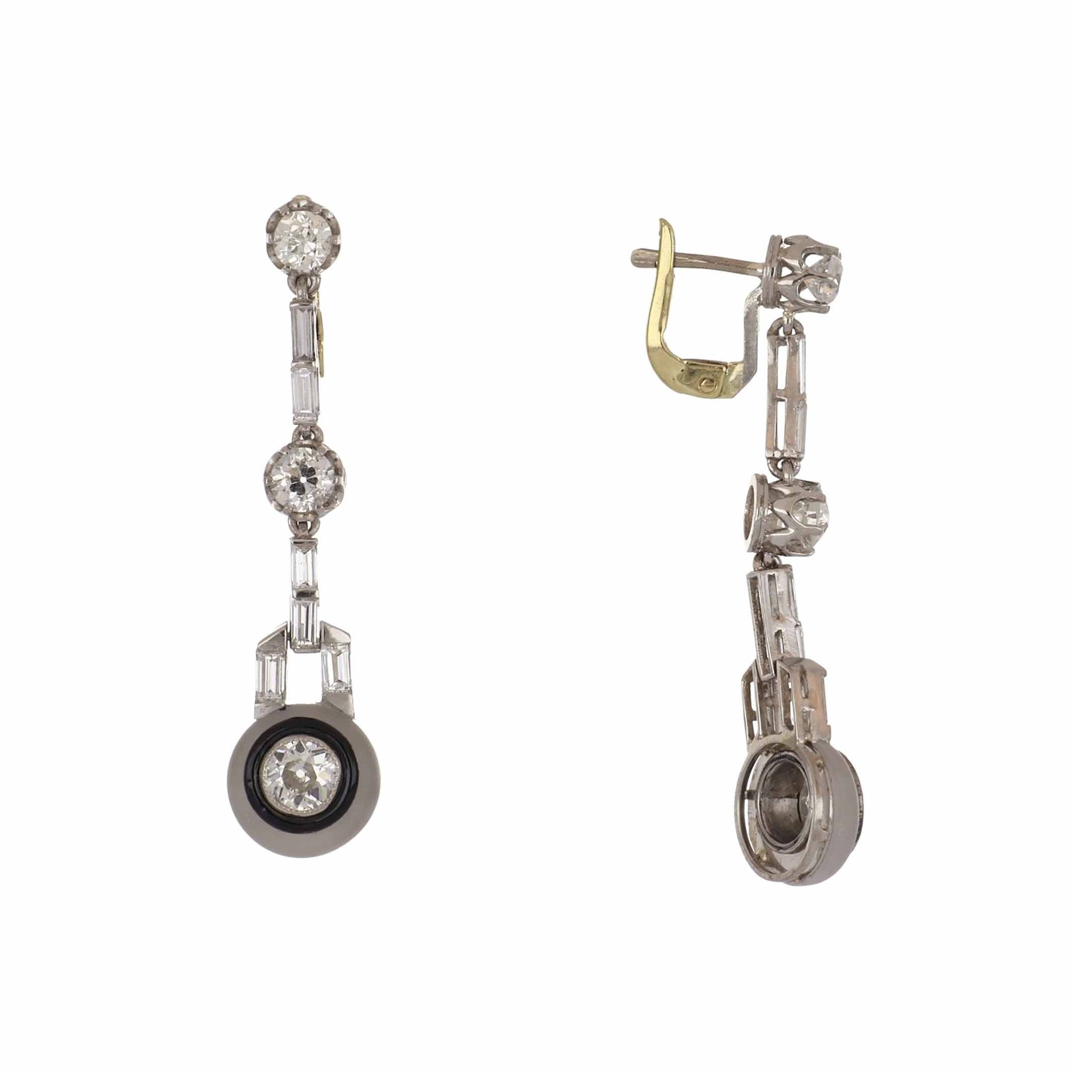 An Art Deco pair of platinum and 18K yellow gold diamond linear drop earrings with black enamel and frosted rock crystal. Circa 1920