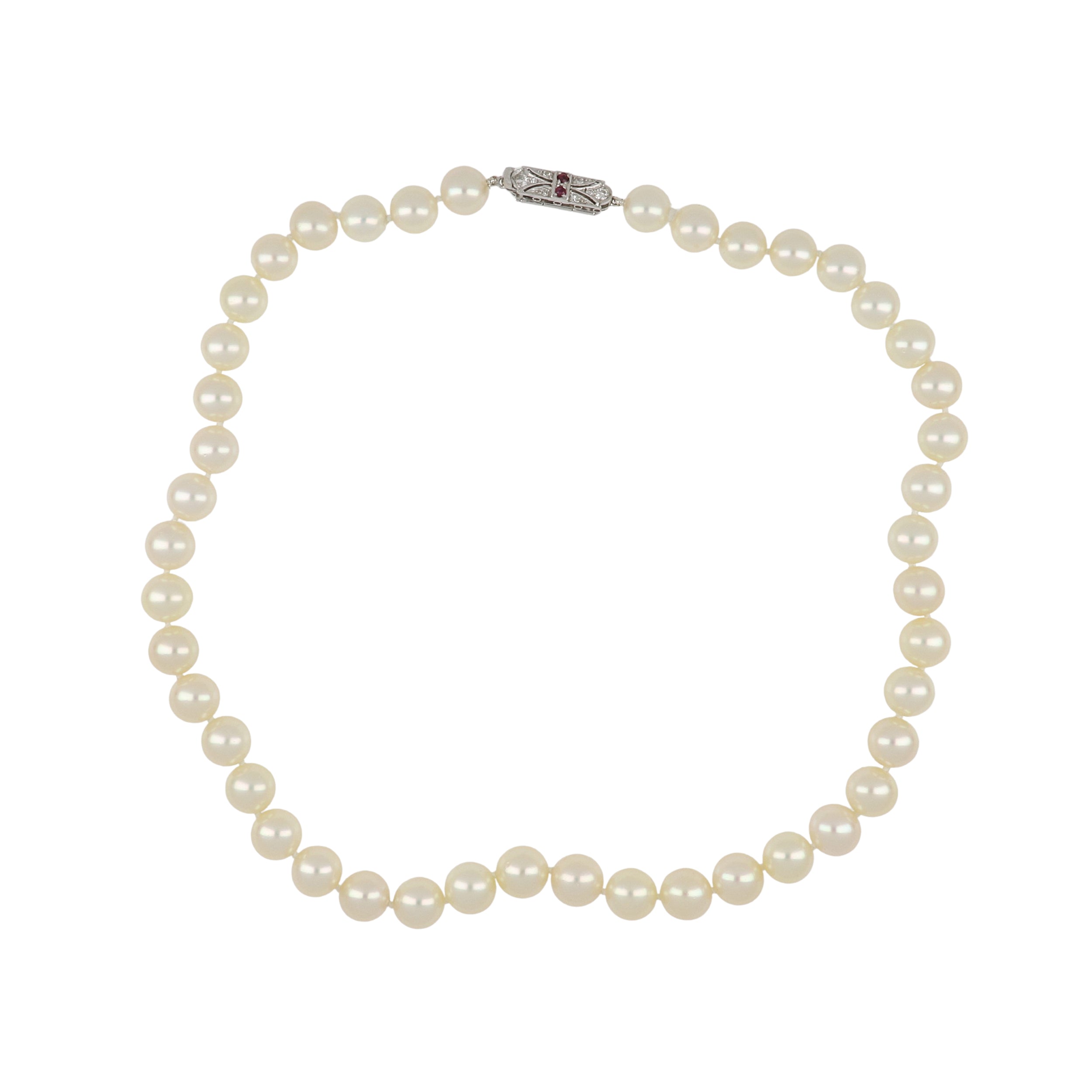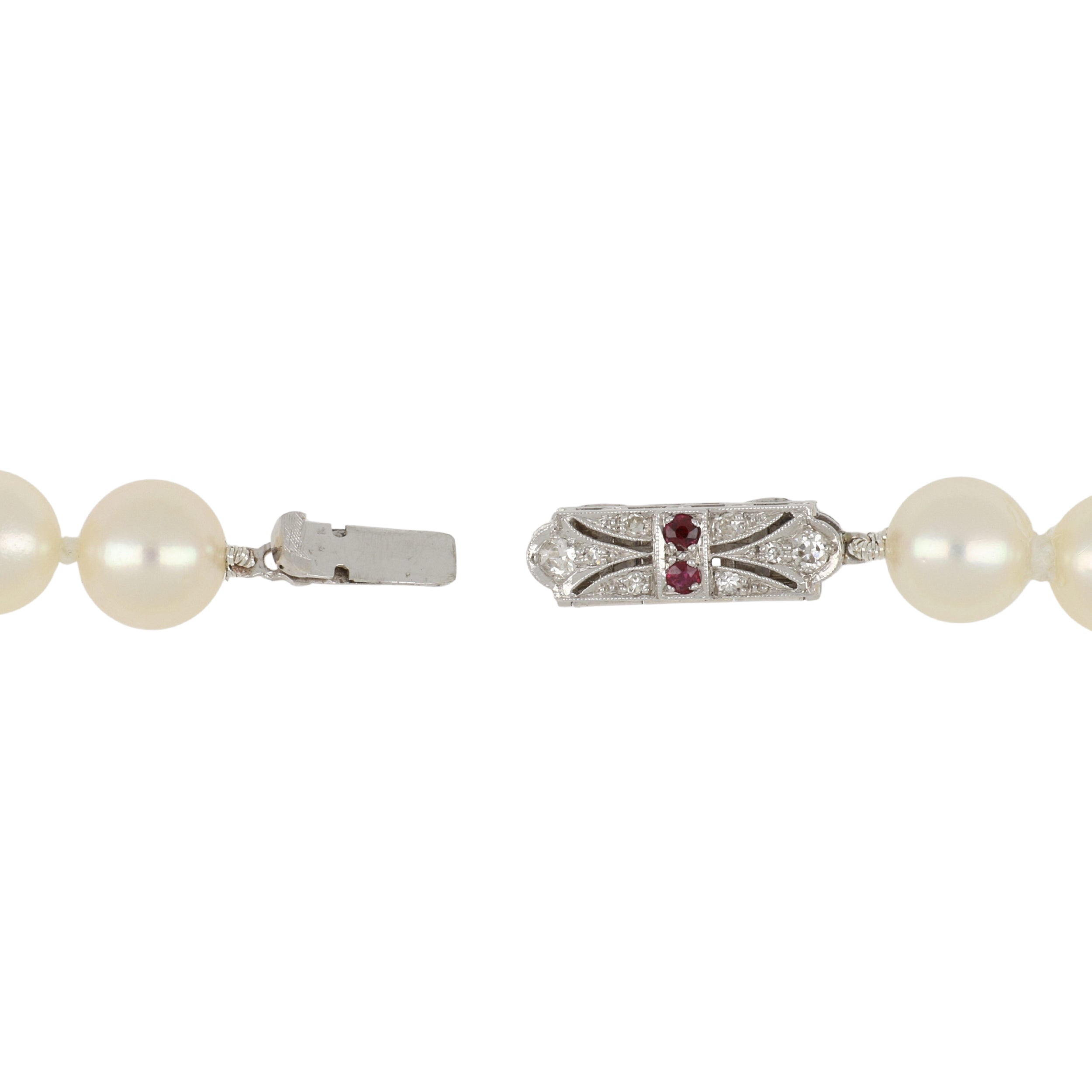 An Art Deco Akoya pearl strand necklace with a ruby and diamond platinum box clasp.