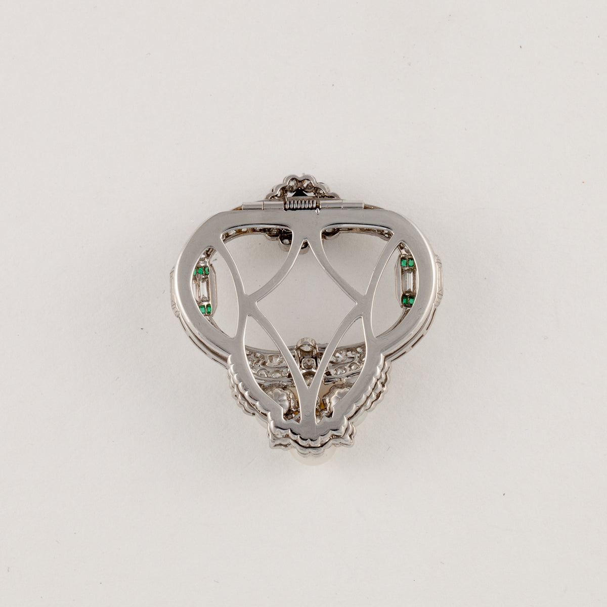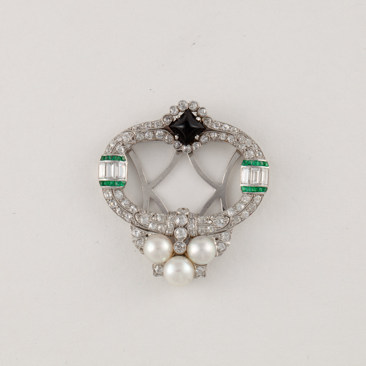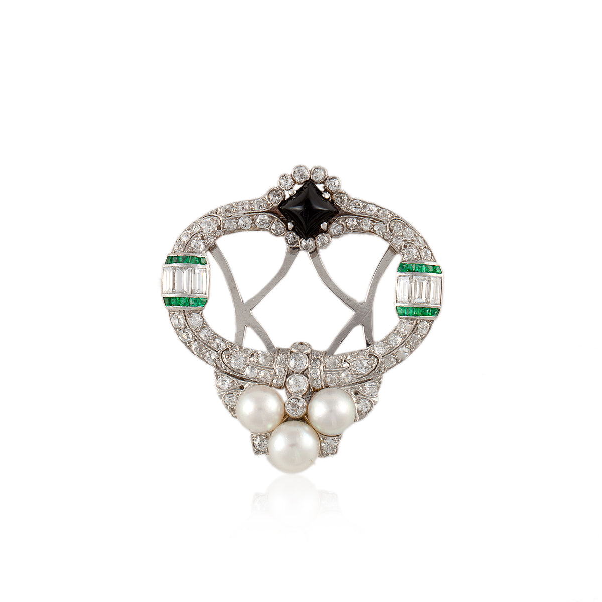 An Art-Deco clip brooch featuring Old Mine-cut diamonds, sugar-loaf onyx, cultured pearls and calibre-cut emeralds set in platinum. Circa 1920.