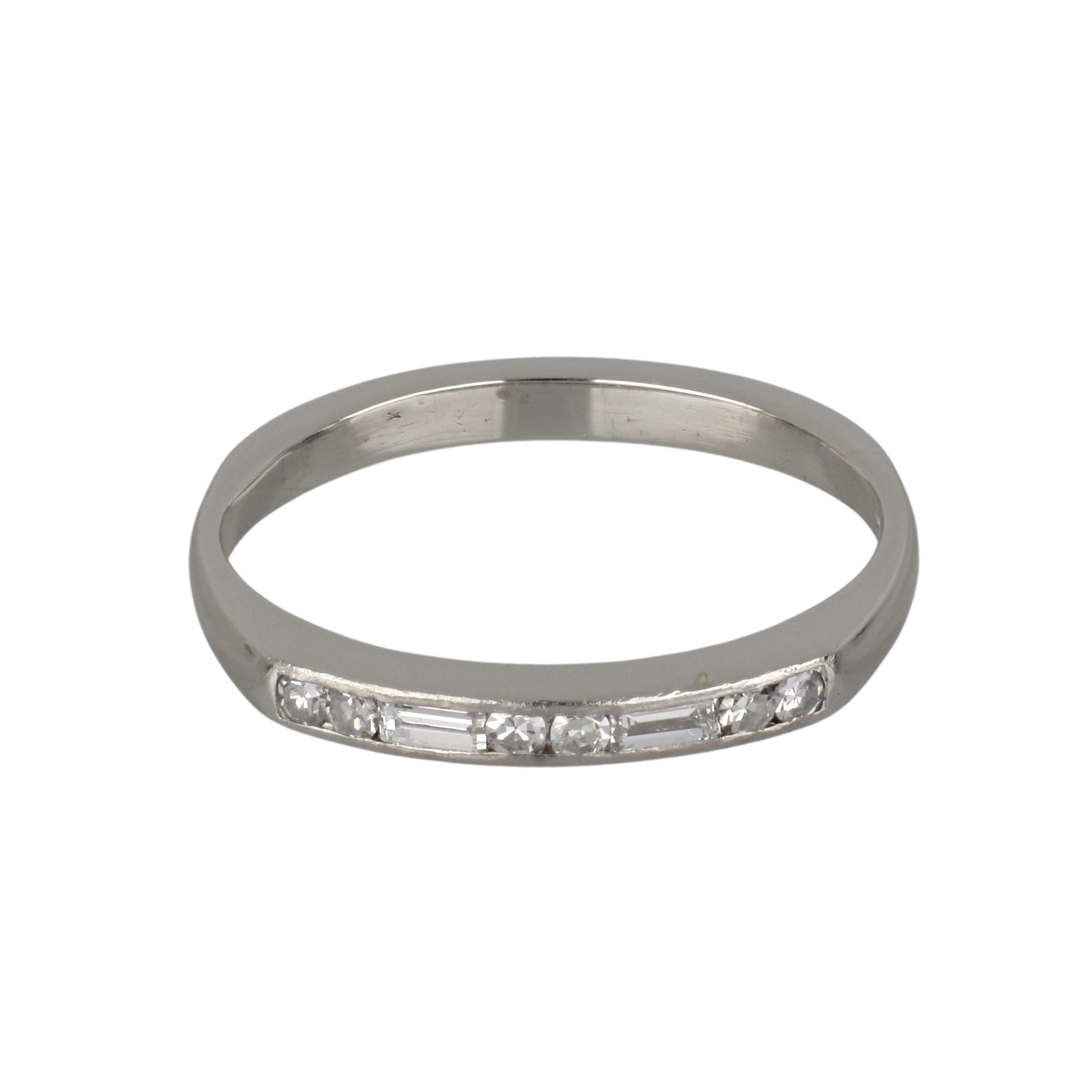An Art-Deco alternating round and baguette-cut diamond half band set in platinum. Circa 1930.