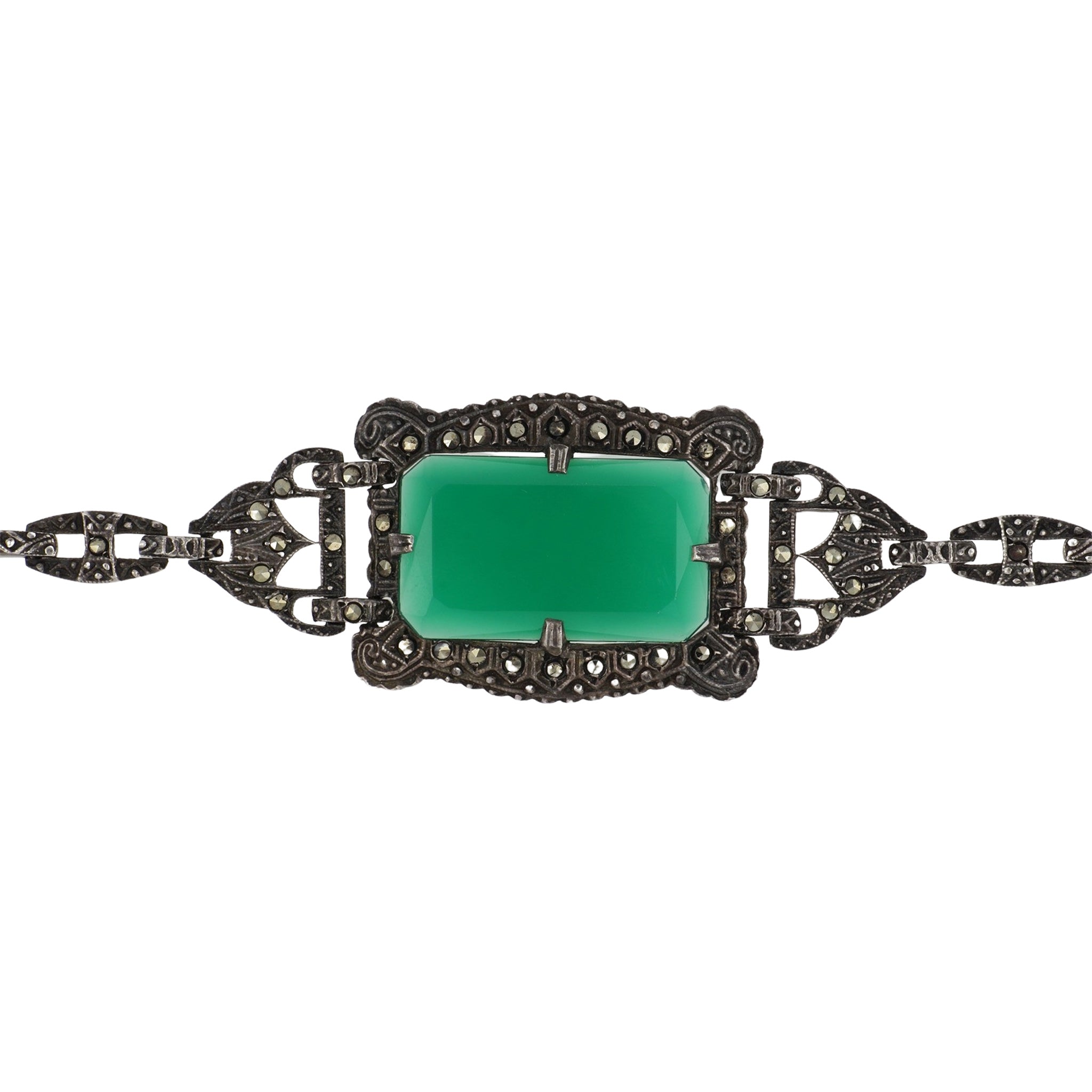 An Art Deco green chalcedony and marcasite plaque bracelet, set in sterling silver. Circa 1930,