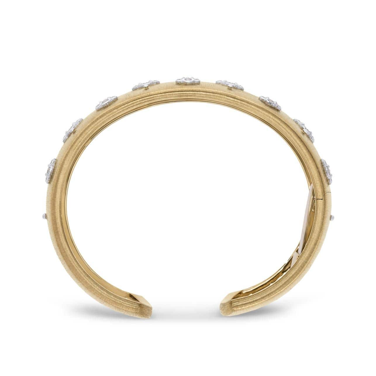 A Buccellati Macri AB cuff bracelet with rigato effect engraving and round brilliant-cut diamonds, crafted in 18K yellow and white gold.