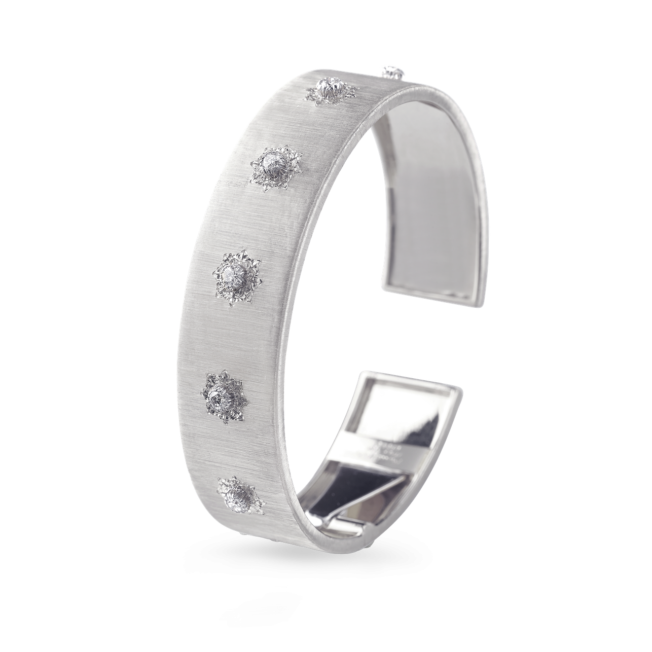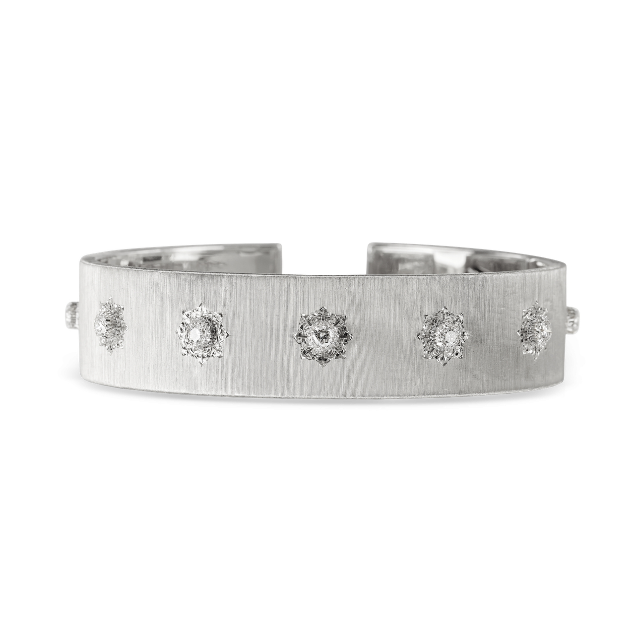 A Buccellati Macri Classica 18K white gold cuff bracelet with rigato effect engraving and diamonds.Official Retailerwidth: 15.5mm7 round brilliant cut diamonds=0.48 total carat weight