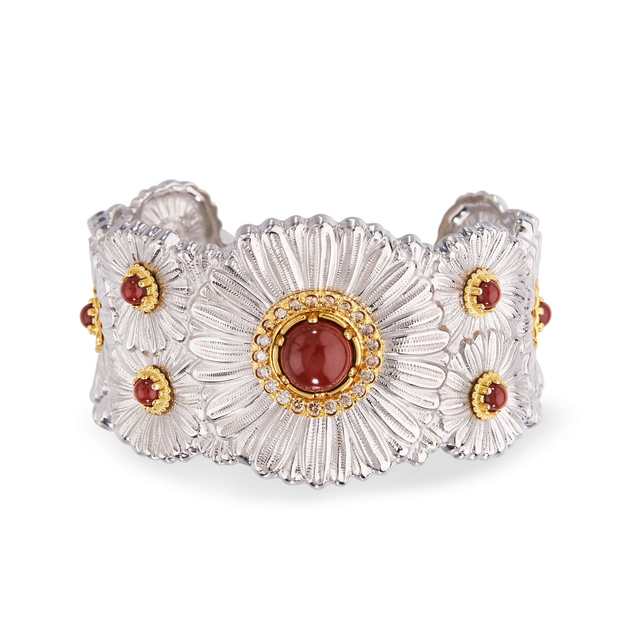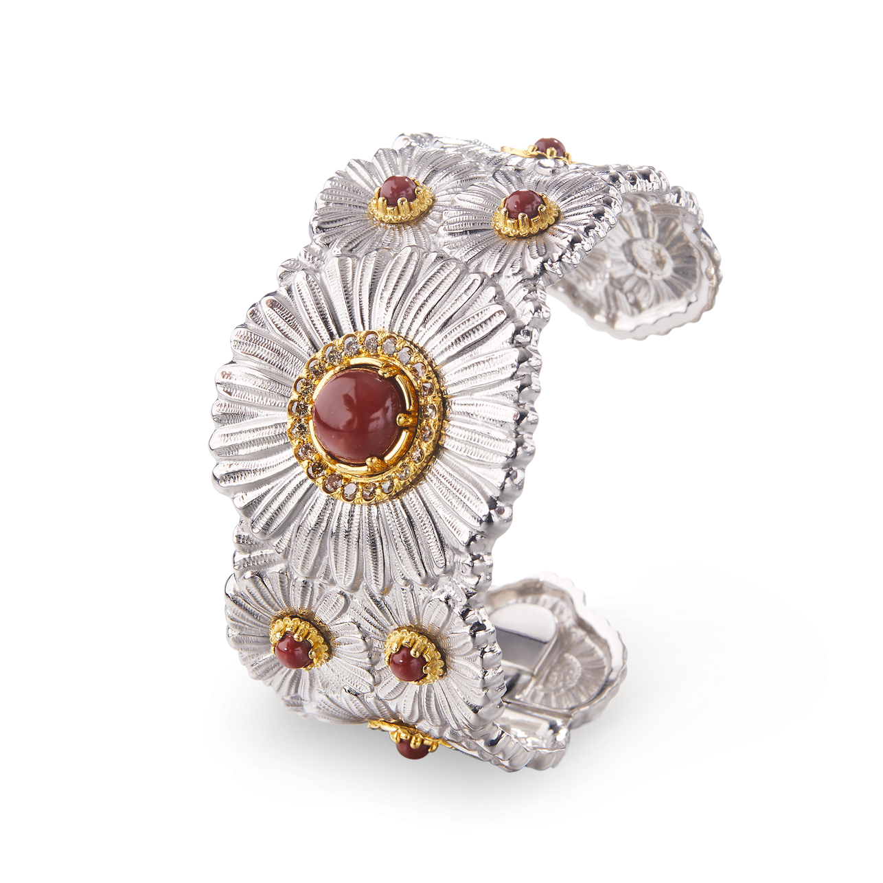 A Buccellati sterling silver & yellow gold accents Daisy Blossom Collection cuff bracelet with red jasper & brown diamonds.