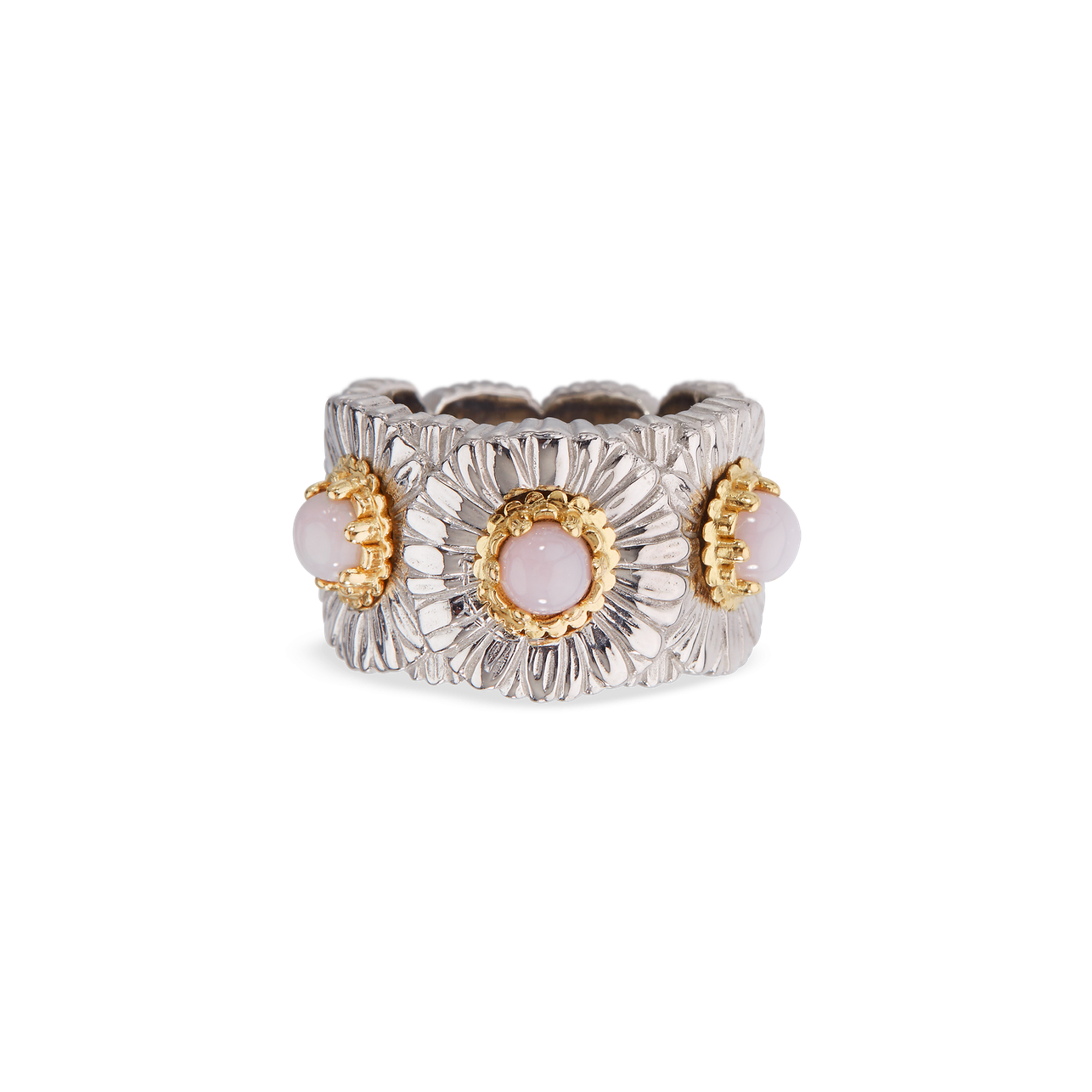 A Buccellati Daisy Eternelle three stone opal ring set in sterling silver with gold plated accents. Official Retailer 3 round cabochon pink opalsFinger size 6.00