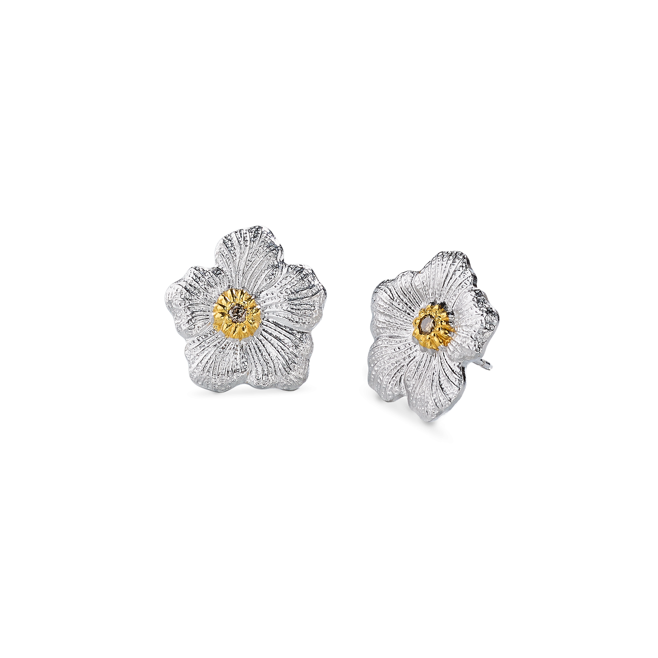 A pair of Buccellati sterling silver & yellow gold accents Gardenia Blossom Collection stud earrings with brown diamond centers. Designer Collection Diameter:1.6cm 2 Round brown diamonds: 0.08 total carat weight