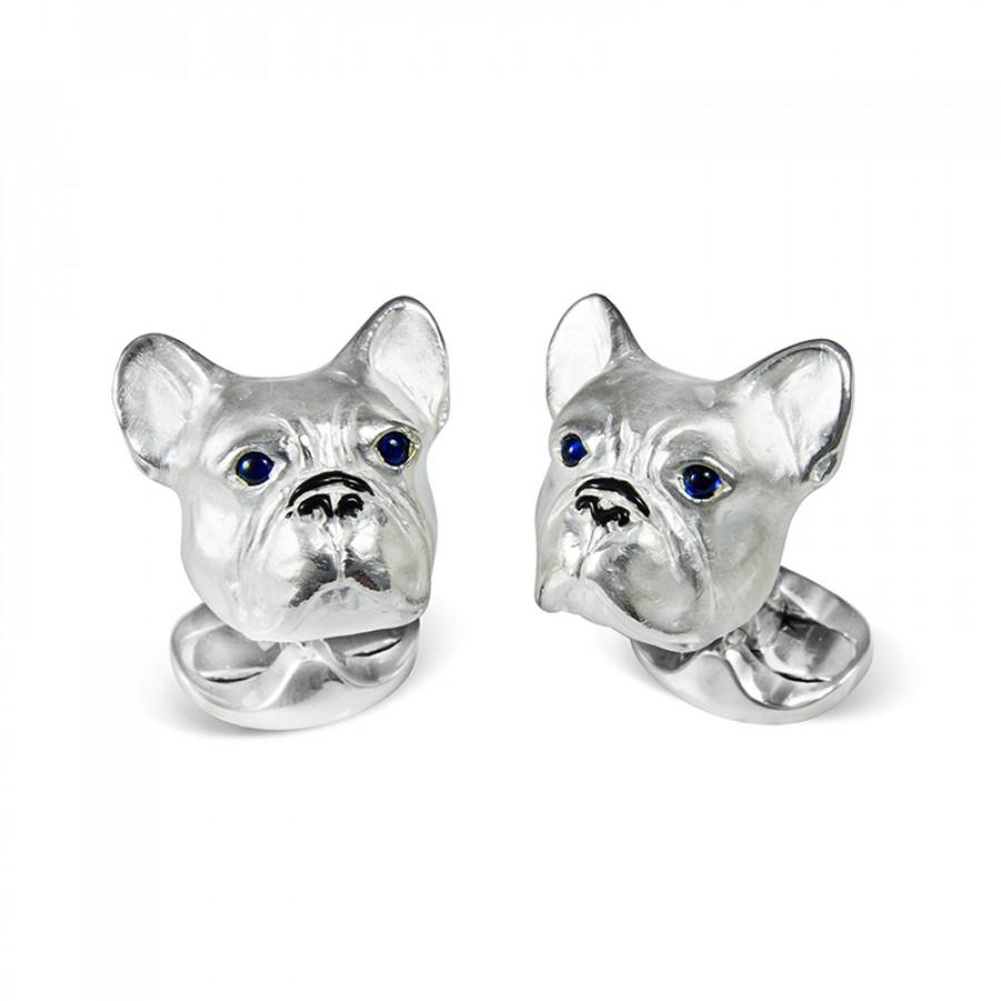 A pair of Deakin & Francis french bulldog cufflinks with sapphire eyes, in sterling silver.
