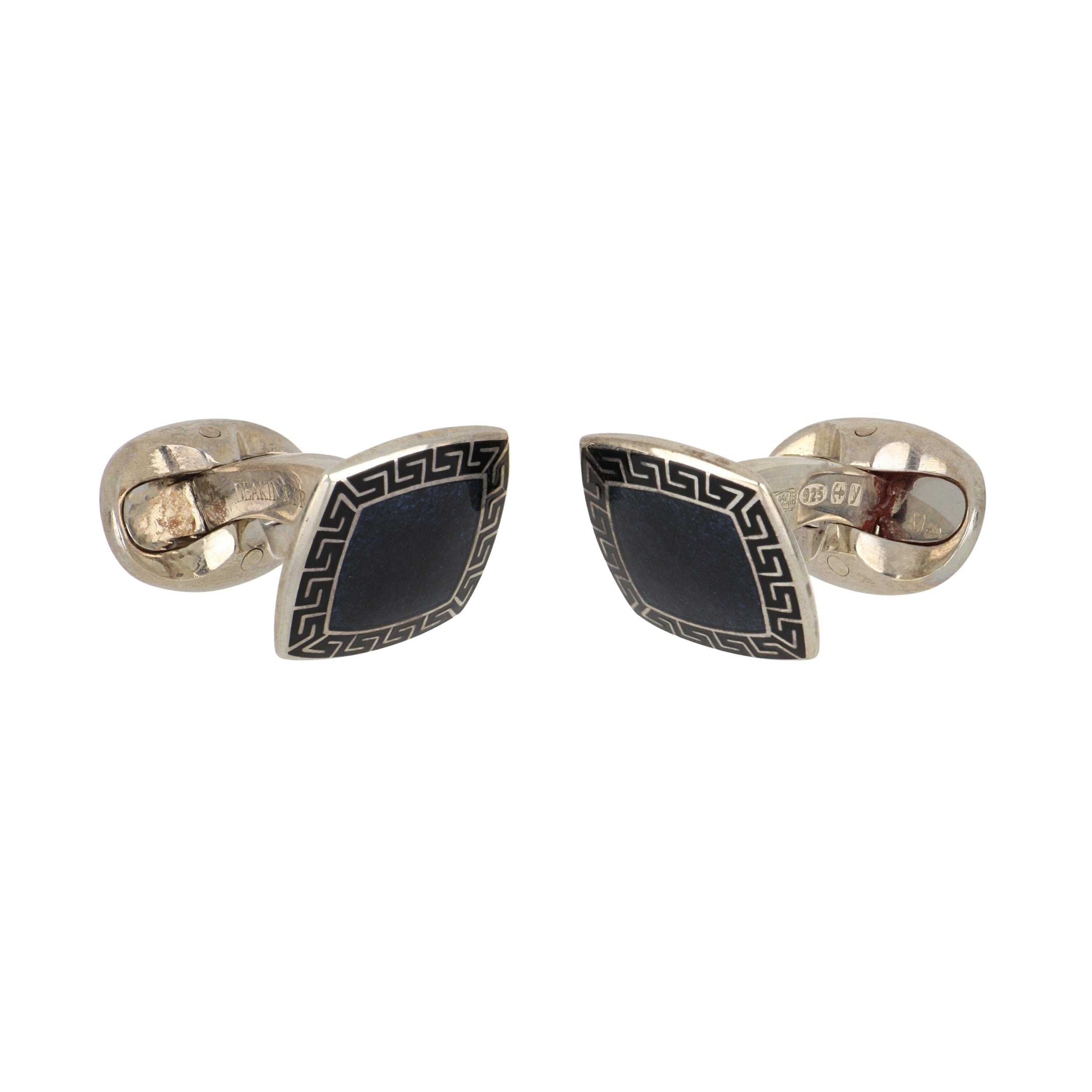 A pair of Deakin & Francis cushion cufflinks with navy blue enamel centers and black enamel borders in sterling silver.