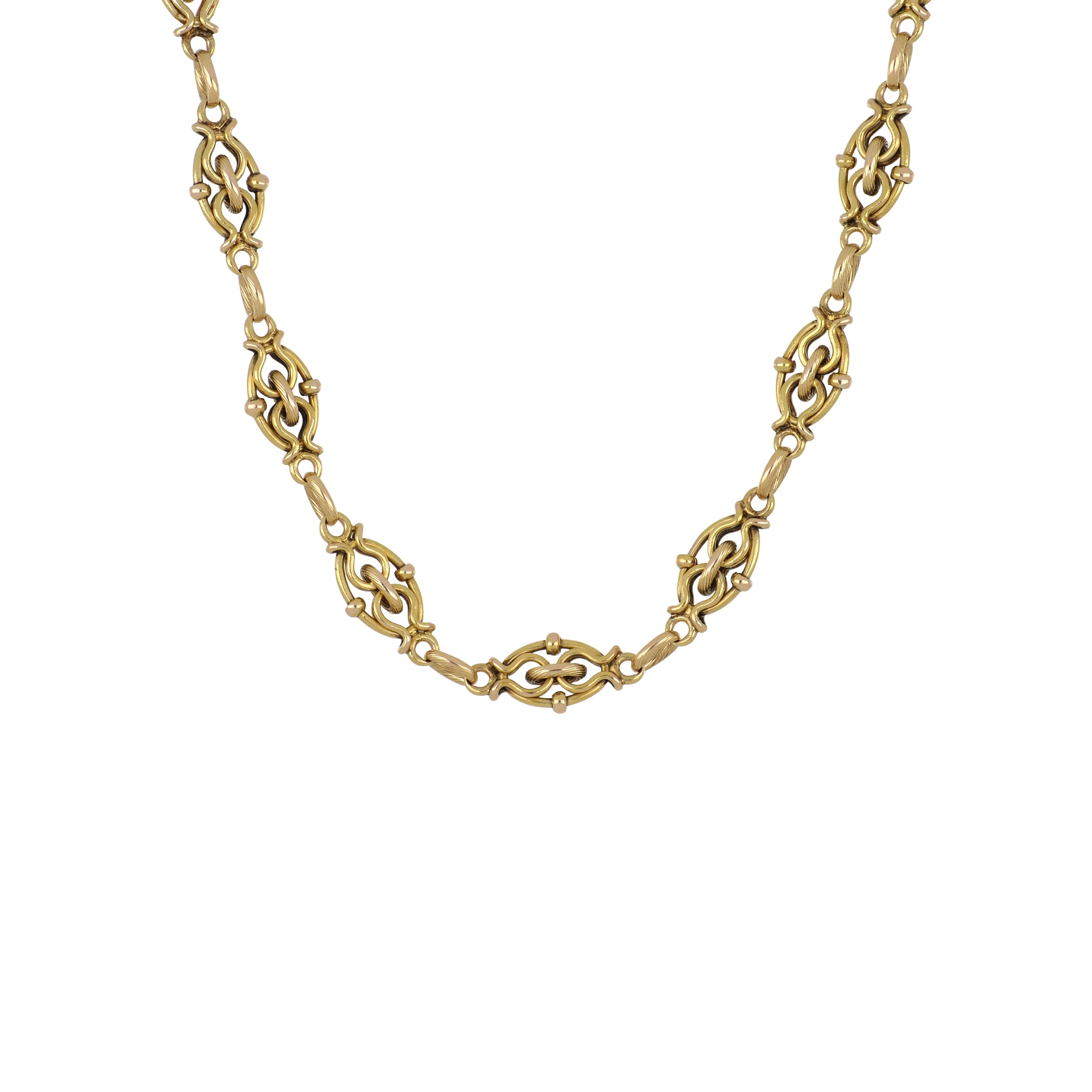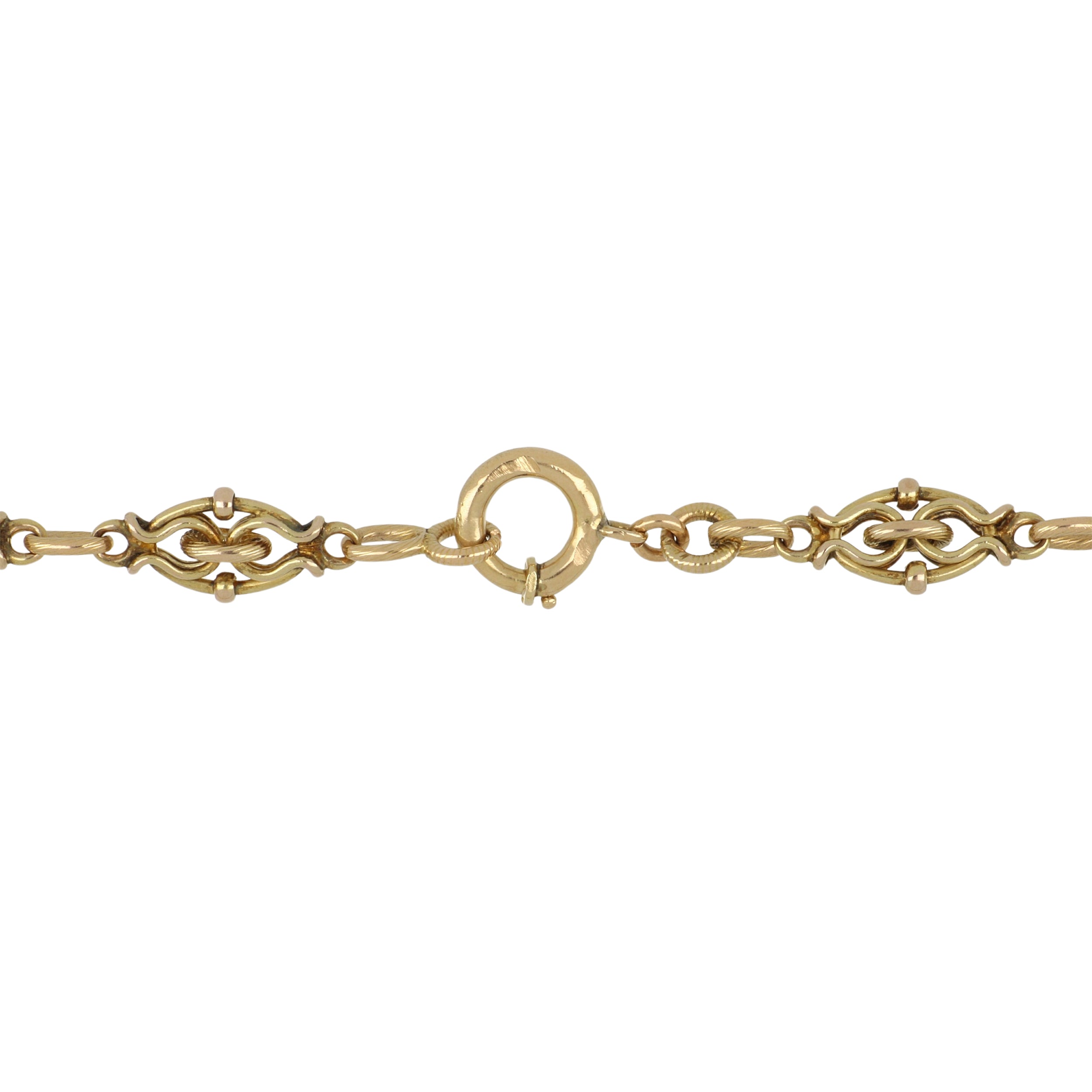 An antique Edwardian fancy link chain set in 14K yellow gold. Circa 1900.