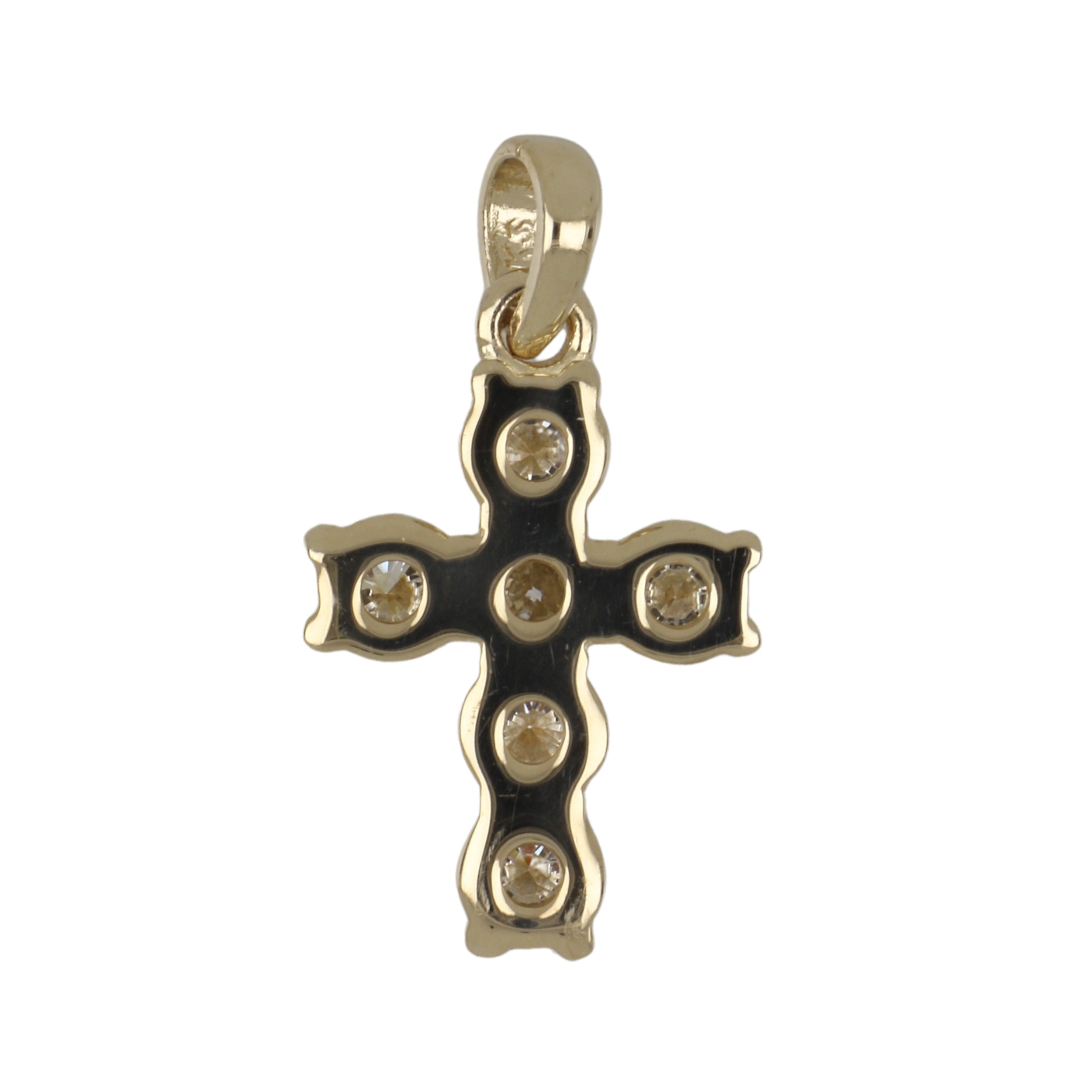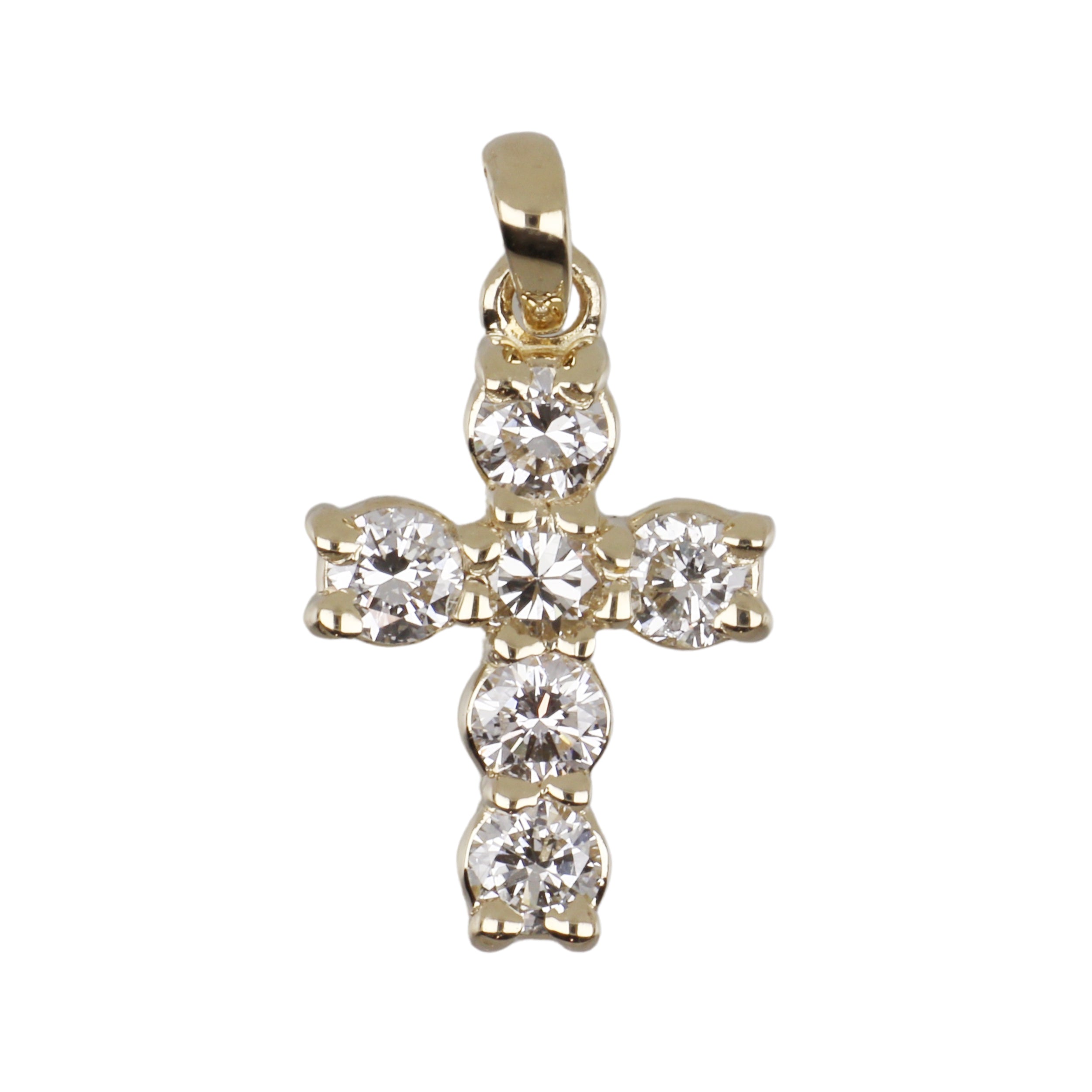 An estate round brilliant-cut diamond cross charm, set in 14K yellow gold.
