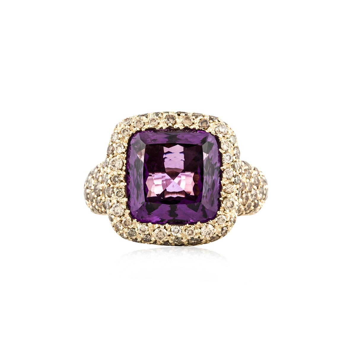 An estate vintage cushion-cut amethyst and round brilliant-cut fancy color diamond ring, set in 18k yellow gold.
