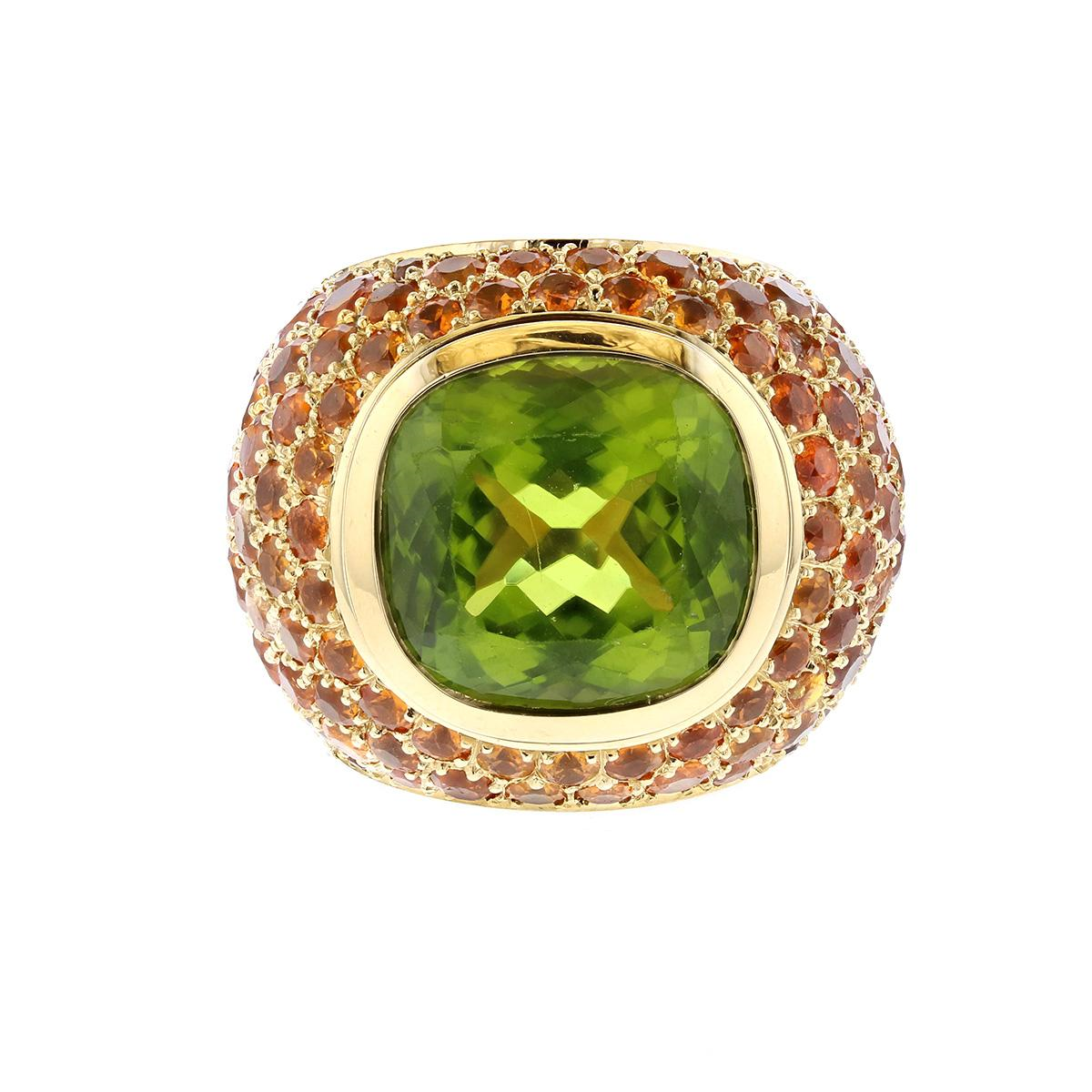 An estate 18 karat yellow gold cushion-cut peridot ring with spessartite garnets. Circa 2010Vintage & Estate CollectionPeridot= 14.35 caratsGarnets= 14.90 total carat weightSize 7