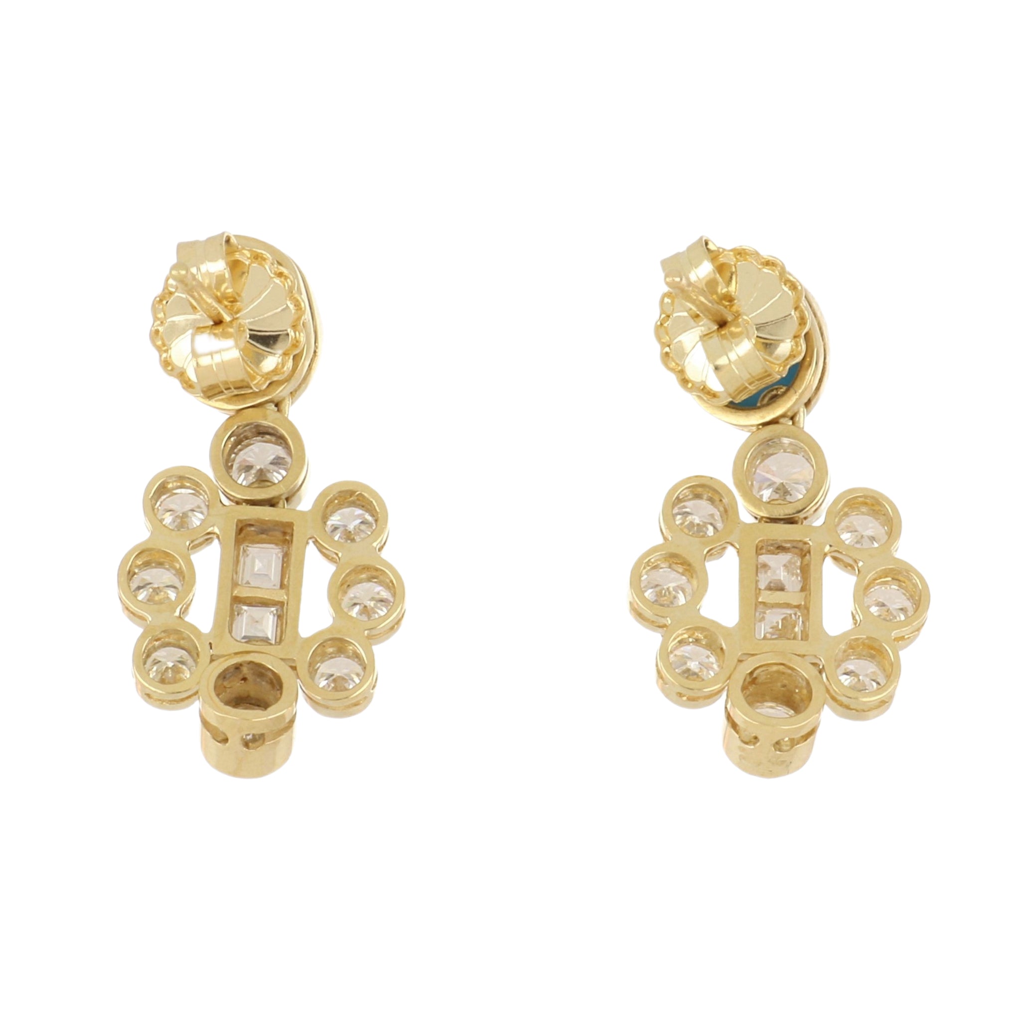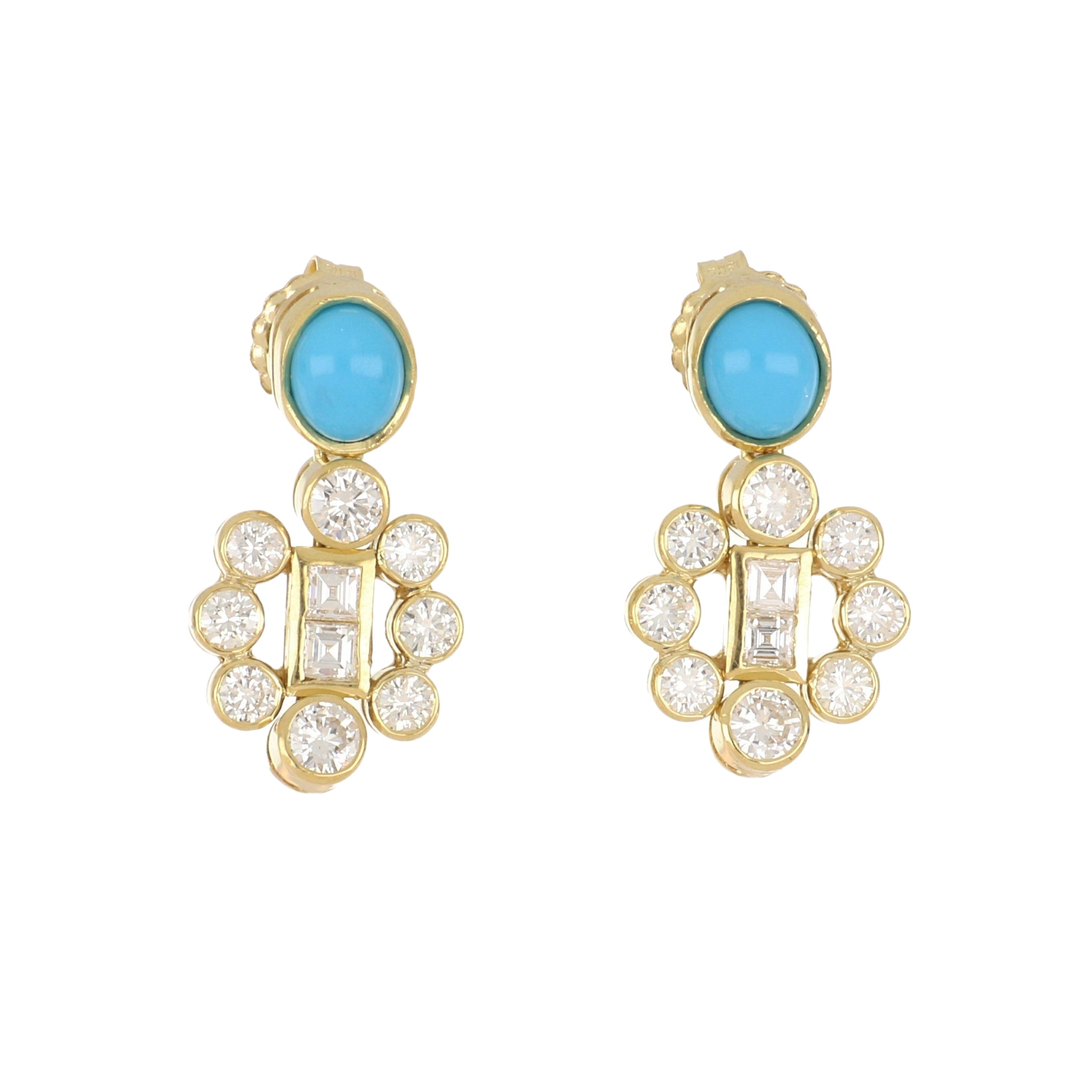A pair of cabochon turquoise and diamond drop earrings, set in 18K yellow gold.