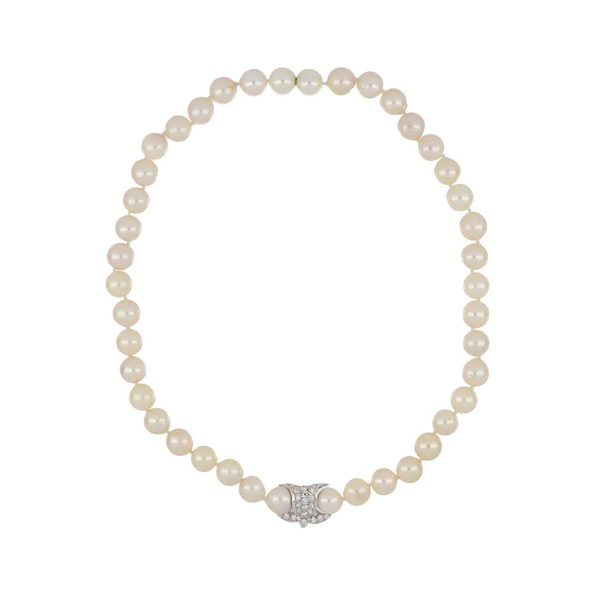 An Akoya pearl necklace with an 18K white gold diamond enhancer invisible clasp.