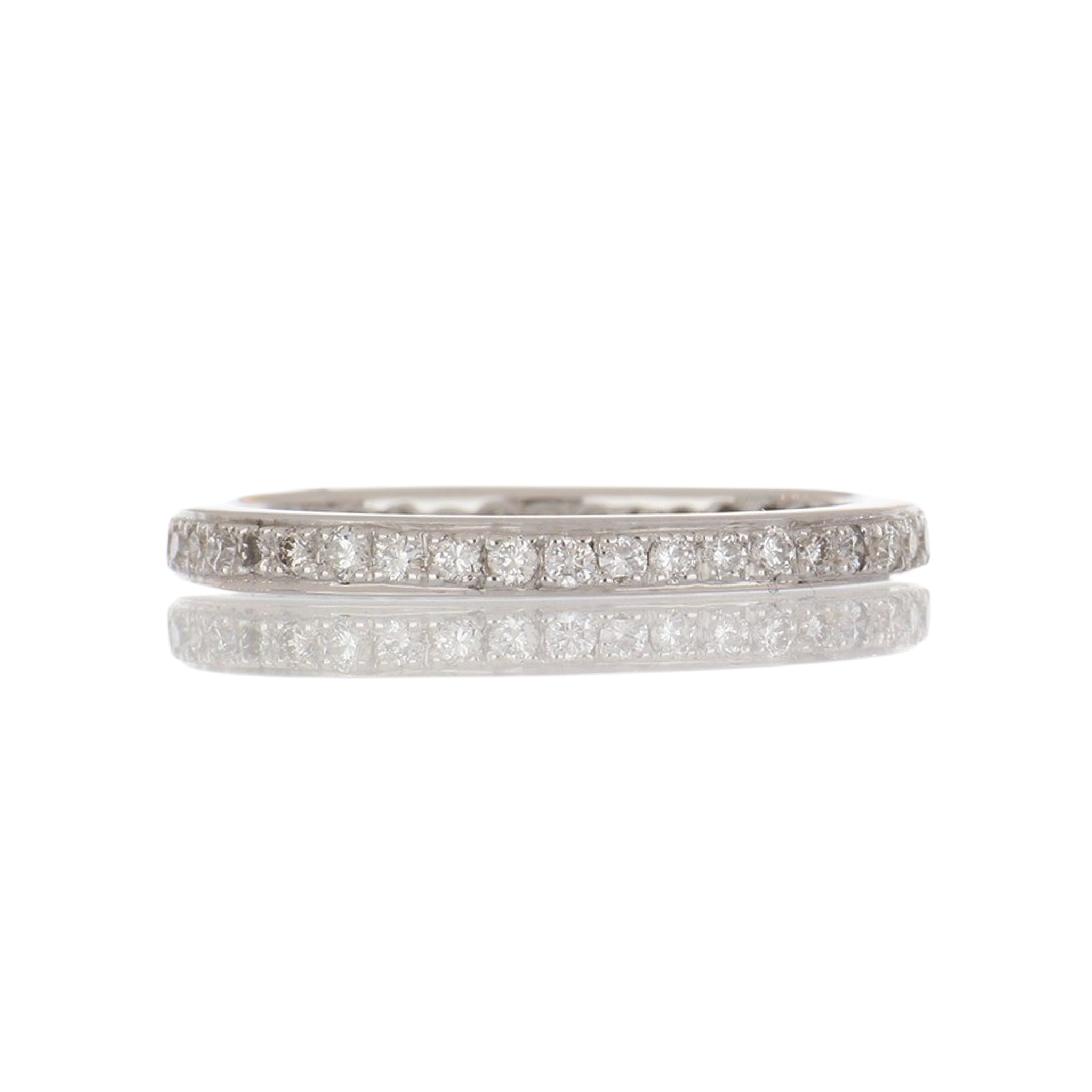 An estate modern, shared prong-set round brilliant-cut diamond eternity band in 18k white gold. Circa 2010.