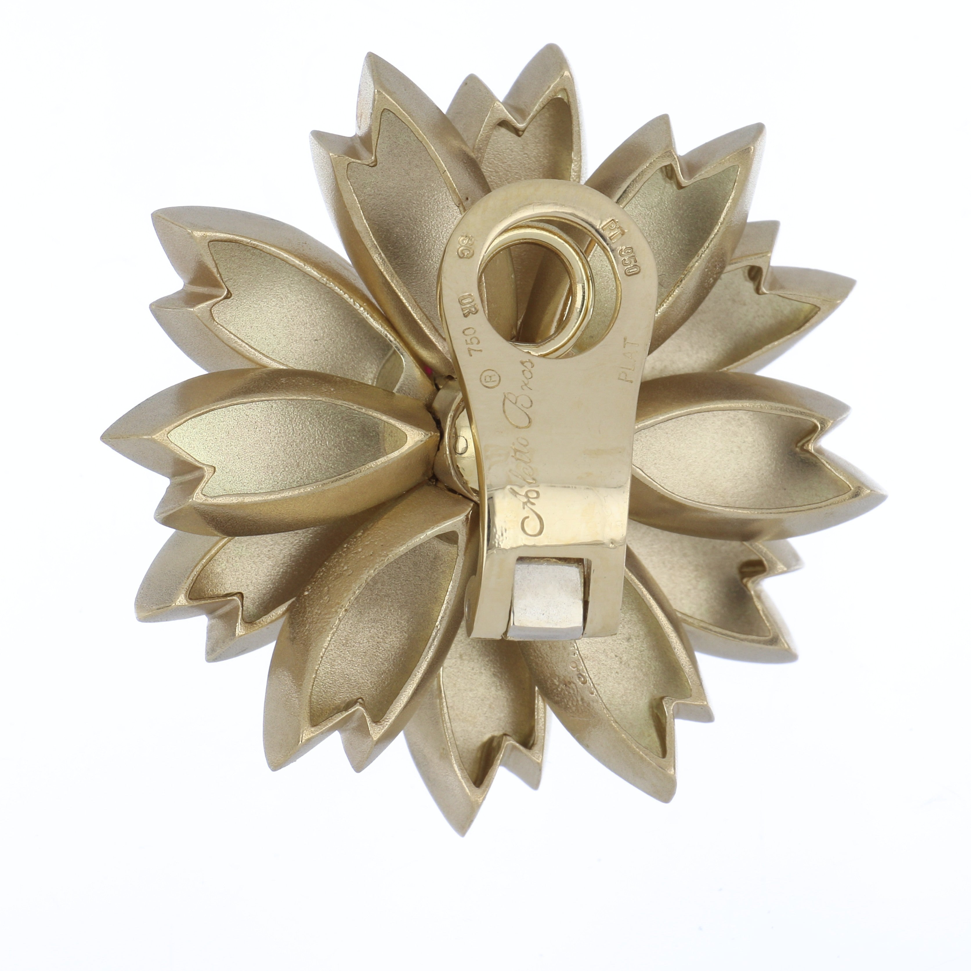 A pair of estate Aletto Brothers articulated floral earrings, set with round ruby and round brilliant-cut diamond centers, in platinum and 18k yellow gold.