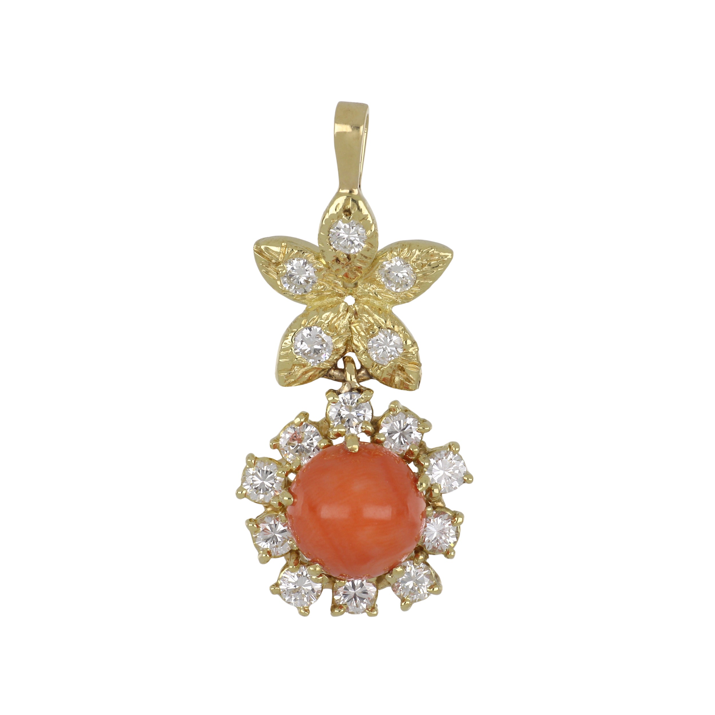 An estate cabochon coral and round brilliant-cut diamond floral motif pendant, set in 18K yellow gold.