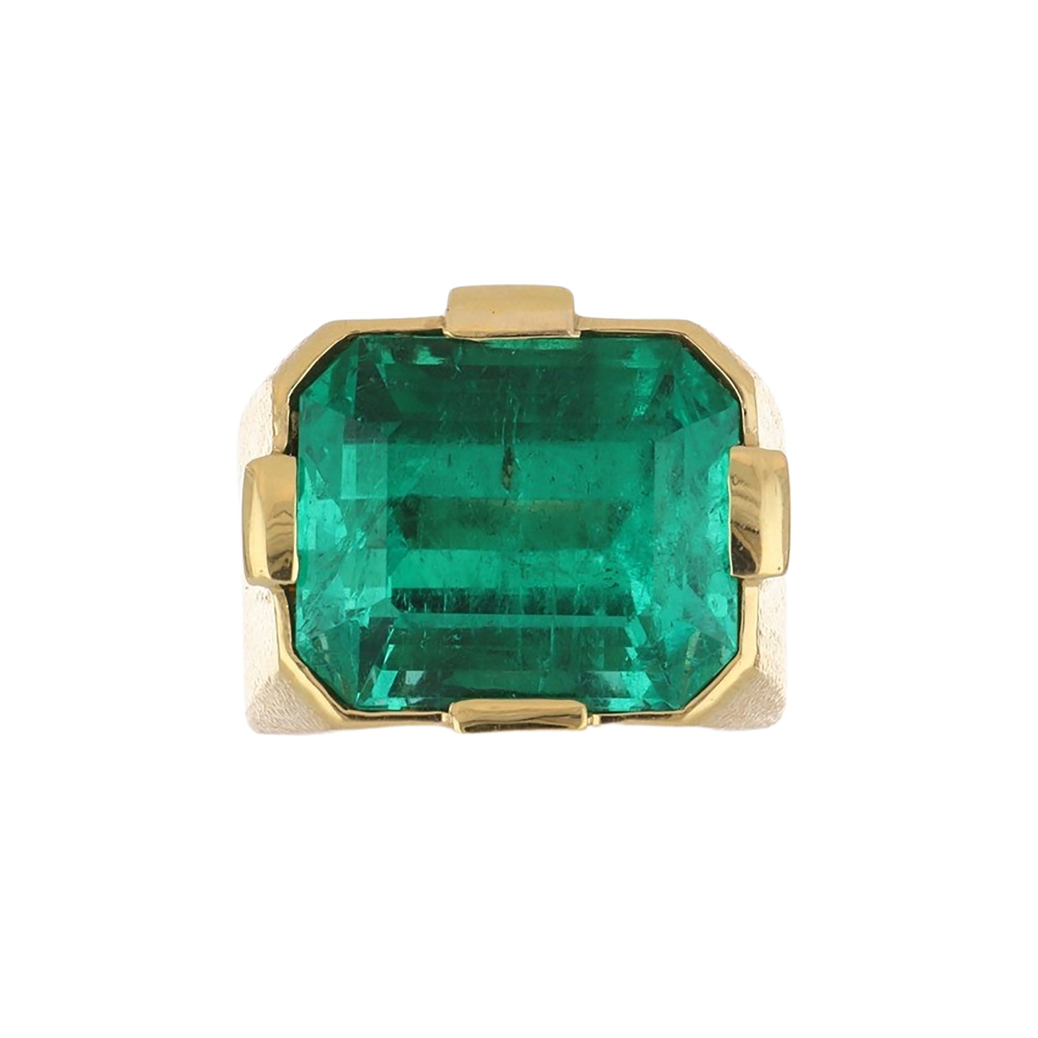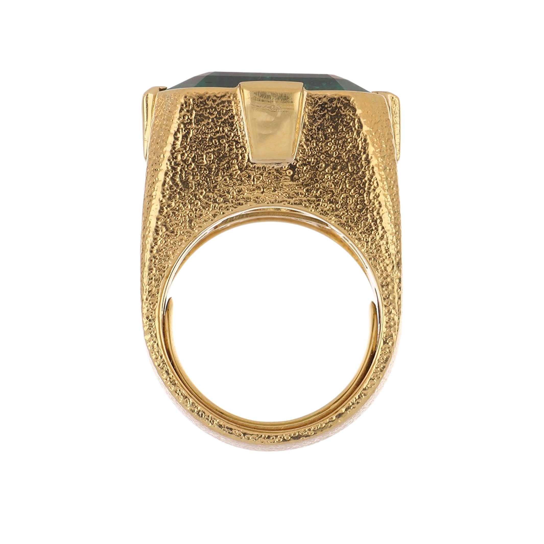 An estate David Webb hammered 18K yellow gold Colombian emerald ring. From the Colors Collection. Circa 2000.