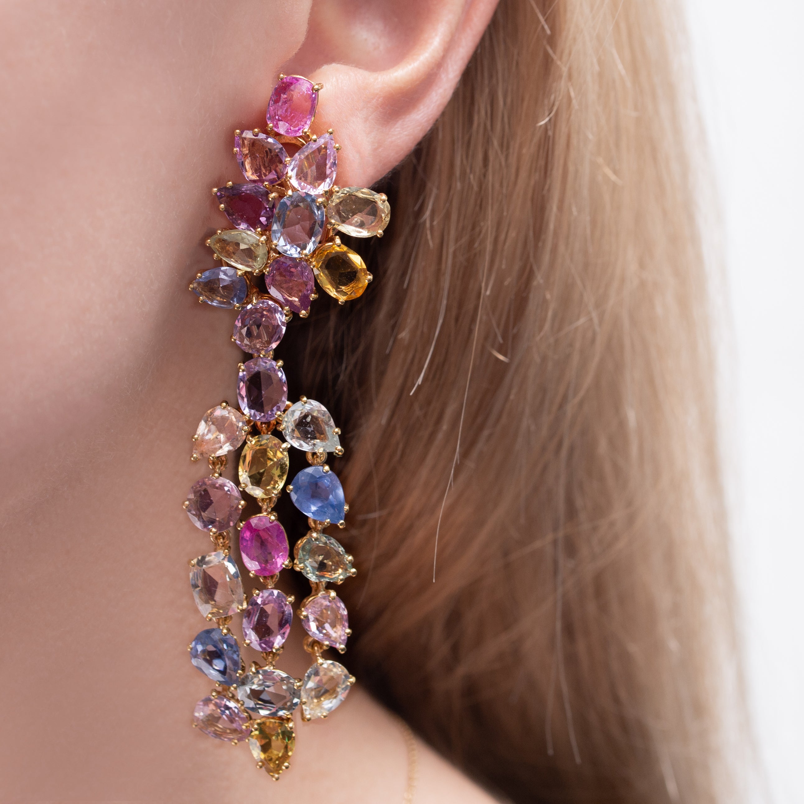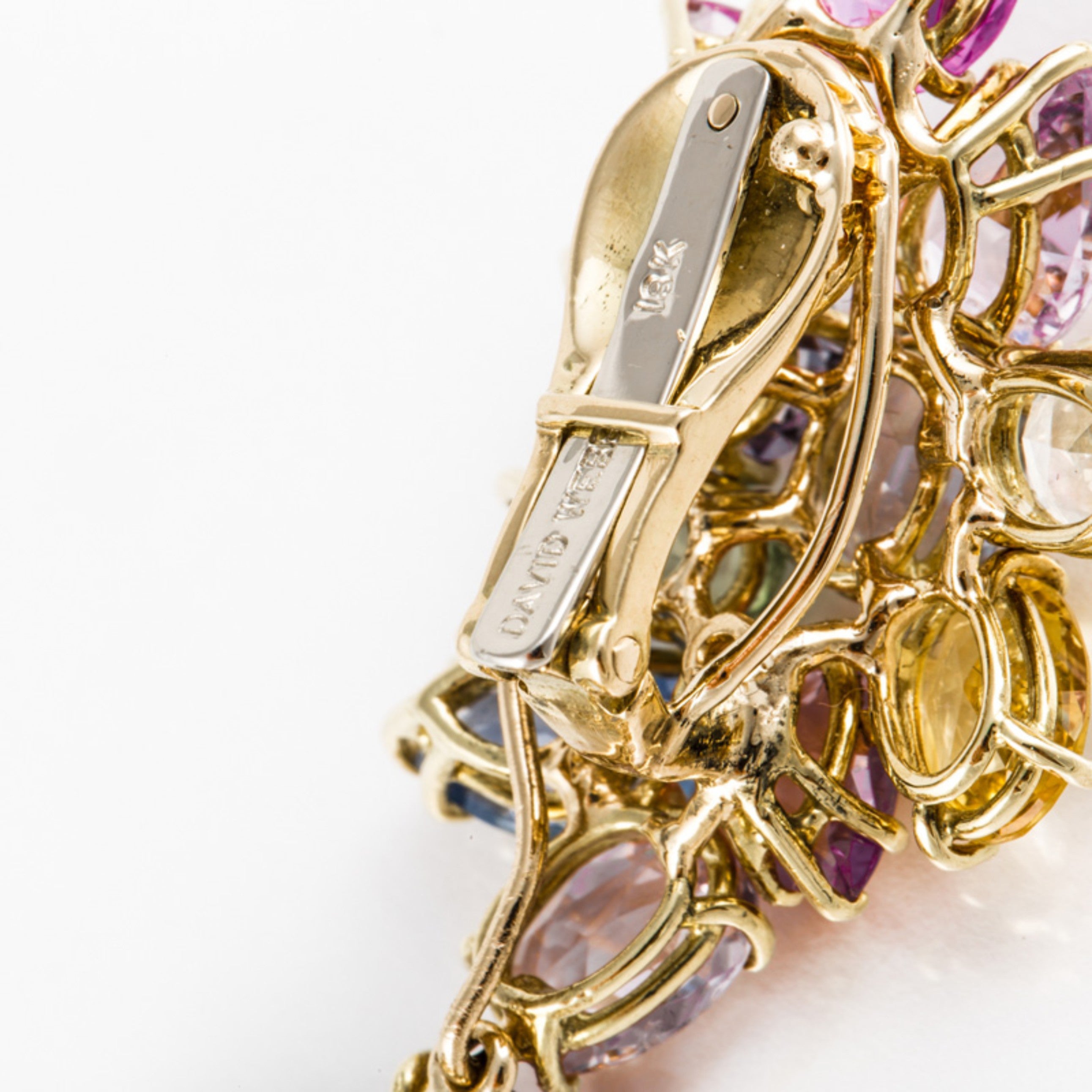 A pair of estate David Webb day/night "Colors Collection" multi-shape fancy color sapphire drop earrings set in 18K yellow gold.