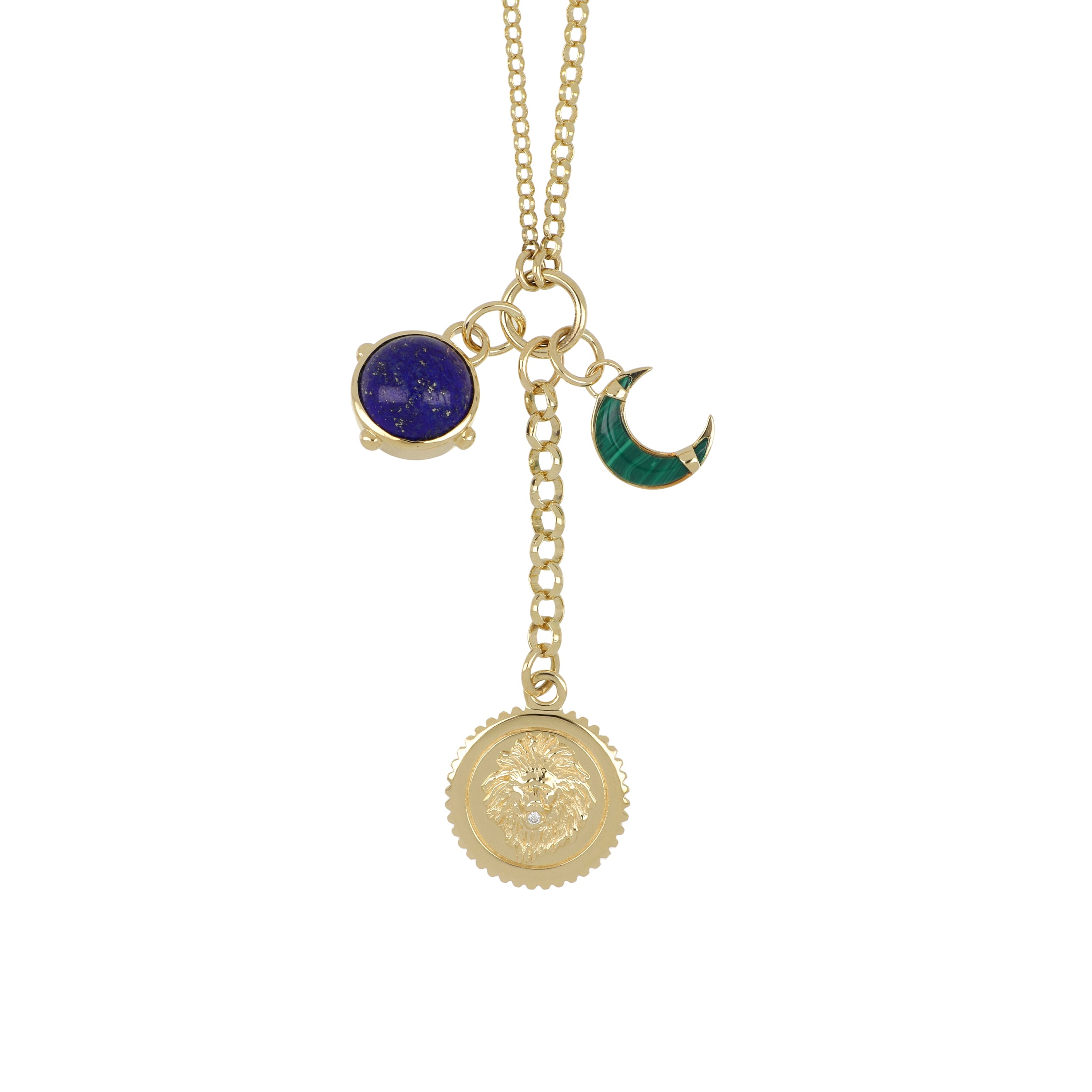 An estate Foundrae 18K yellow gold triple charm Belcher chain necklace, with lapis sphere, malachite moon, and diamond-set medallion charms.