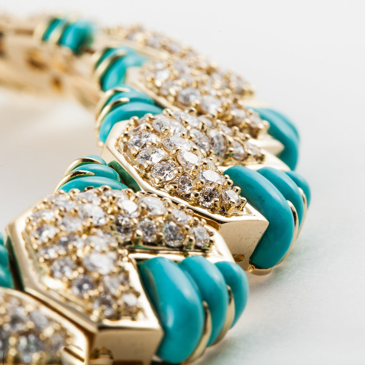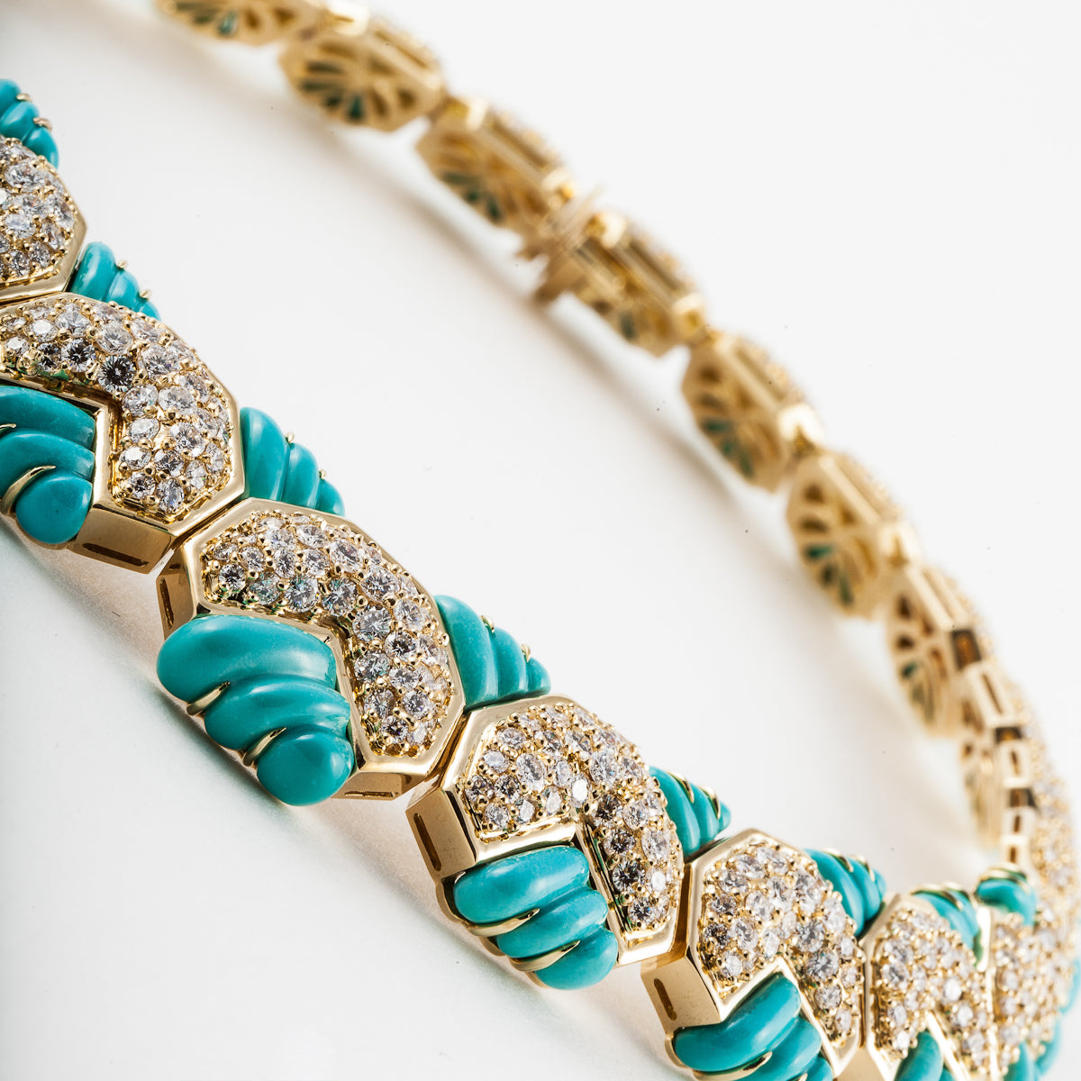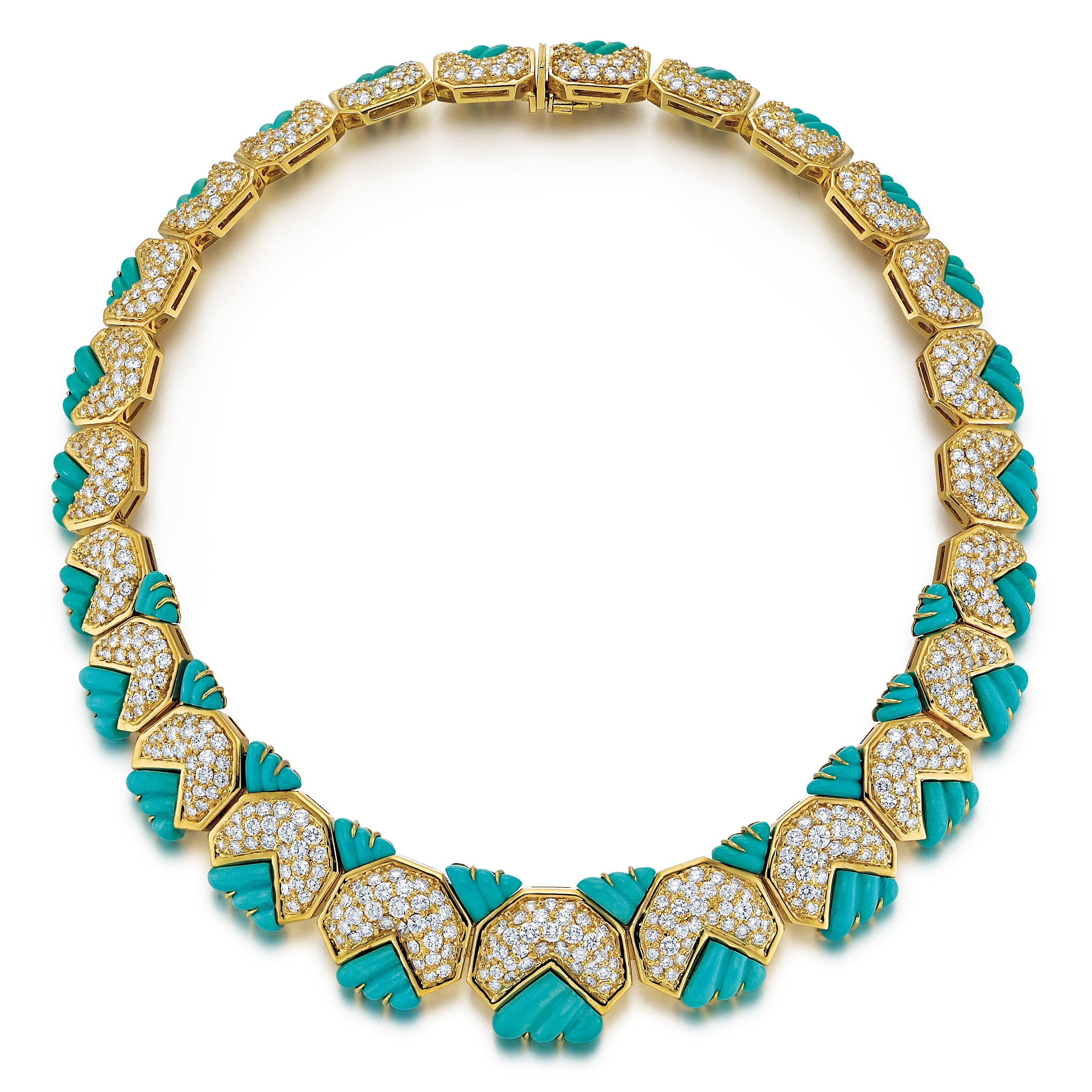 An estate Hammerman Brothers carved turquoise and pave diamond collar necklace, set in 18K yellow gold.