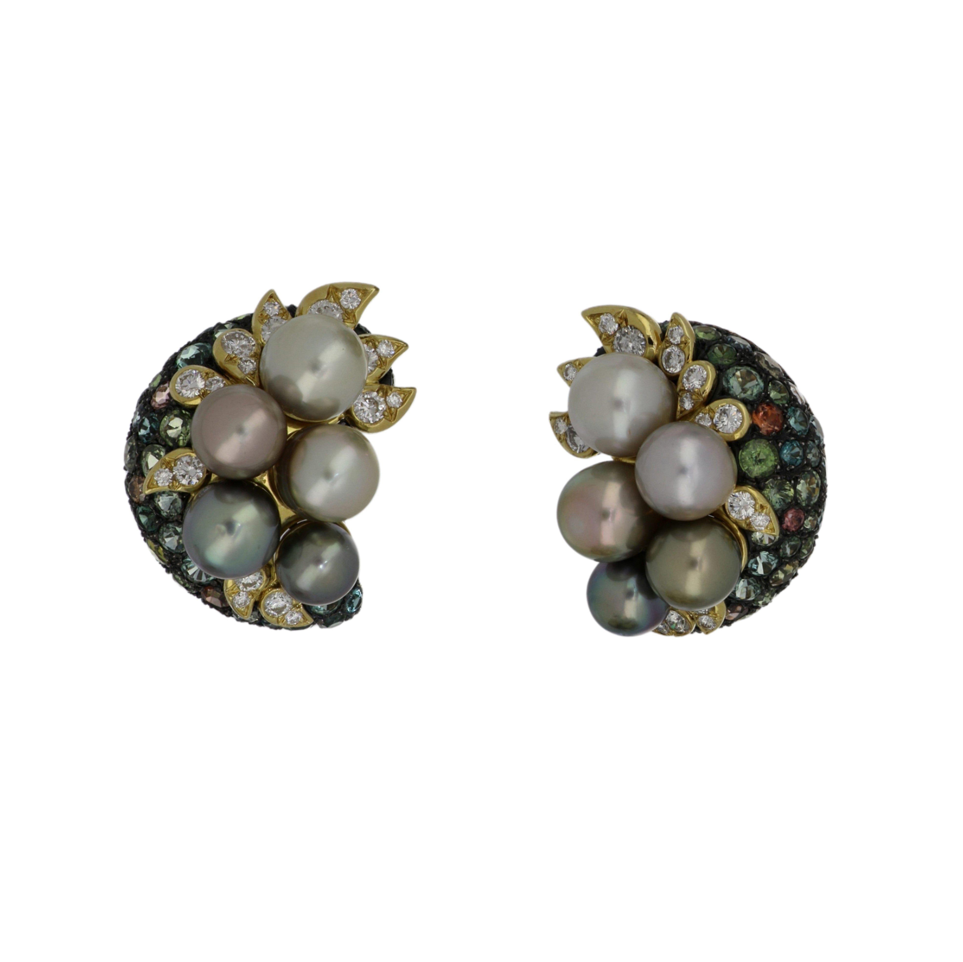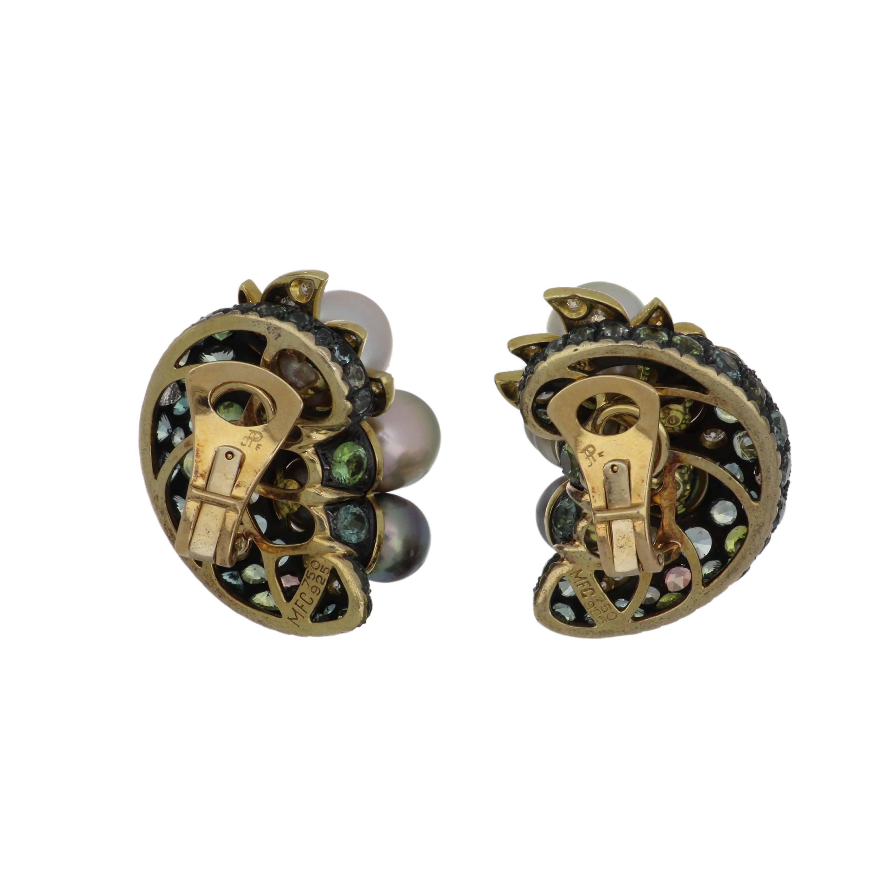 A pair of estate Marilyn Cooperman pearl cluster, gemstone & diamond earrings, set in sterling silver & 18K yellow gold.