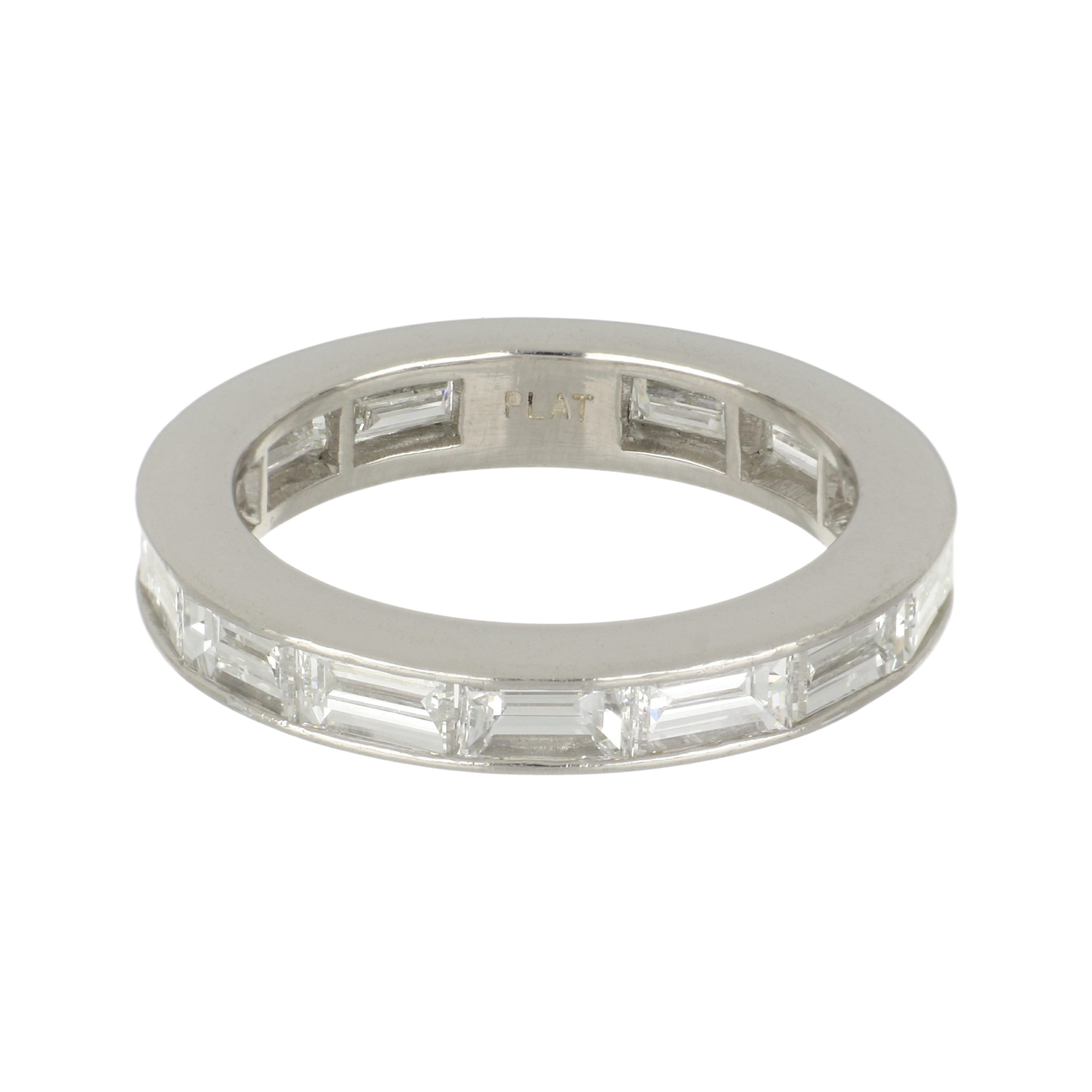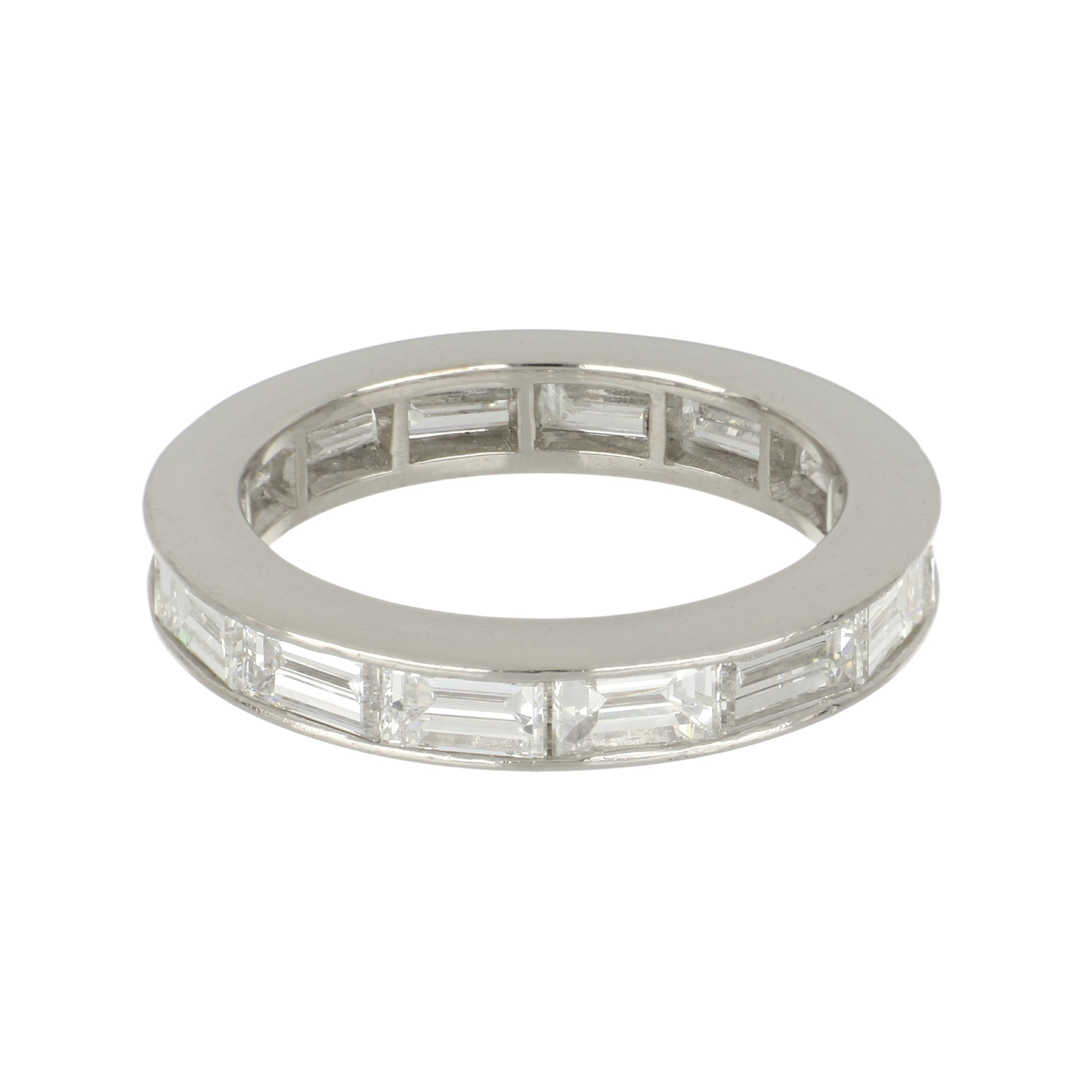 An estate channel-set, east-west baguette-cut diamond eternity band set in platinum.