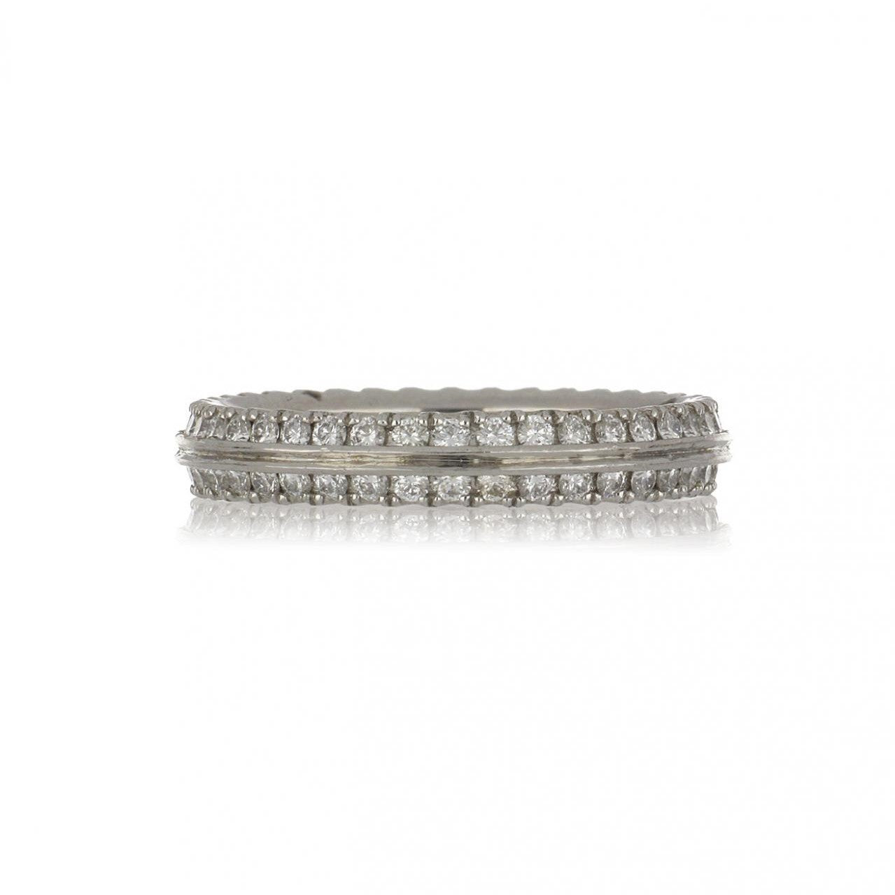 A platinum divided two row prong-set round brilliant-cut diamond eternity band.