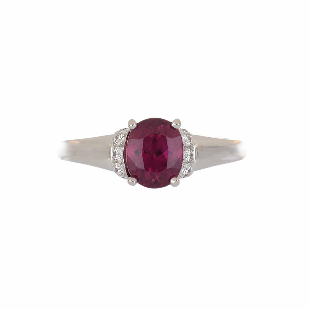 An estate platinum oval ruby and diamond ring. Circa 2010.Vintage & Estate CollectionRuby: 2.00 carats, accompanied by a James Allen ReportDiamonds: 0.21 total carat weight
