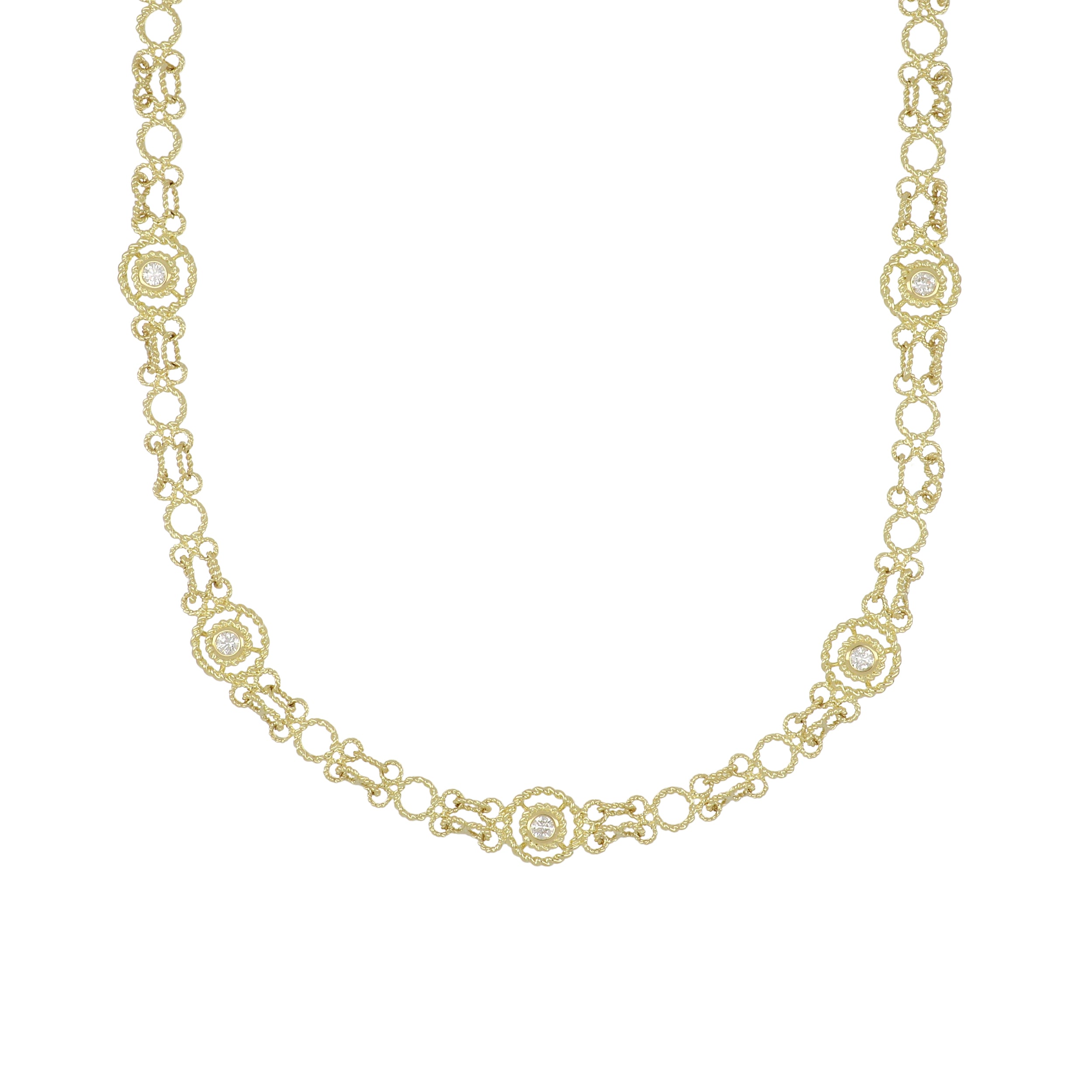 An estate Roberto Coin fancy link cable necklace bezel-set with round brilliant-cut diamond stations in 18K yellow gold, with a signature ruby on the clasp.