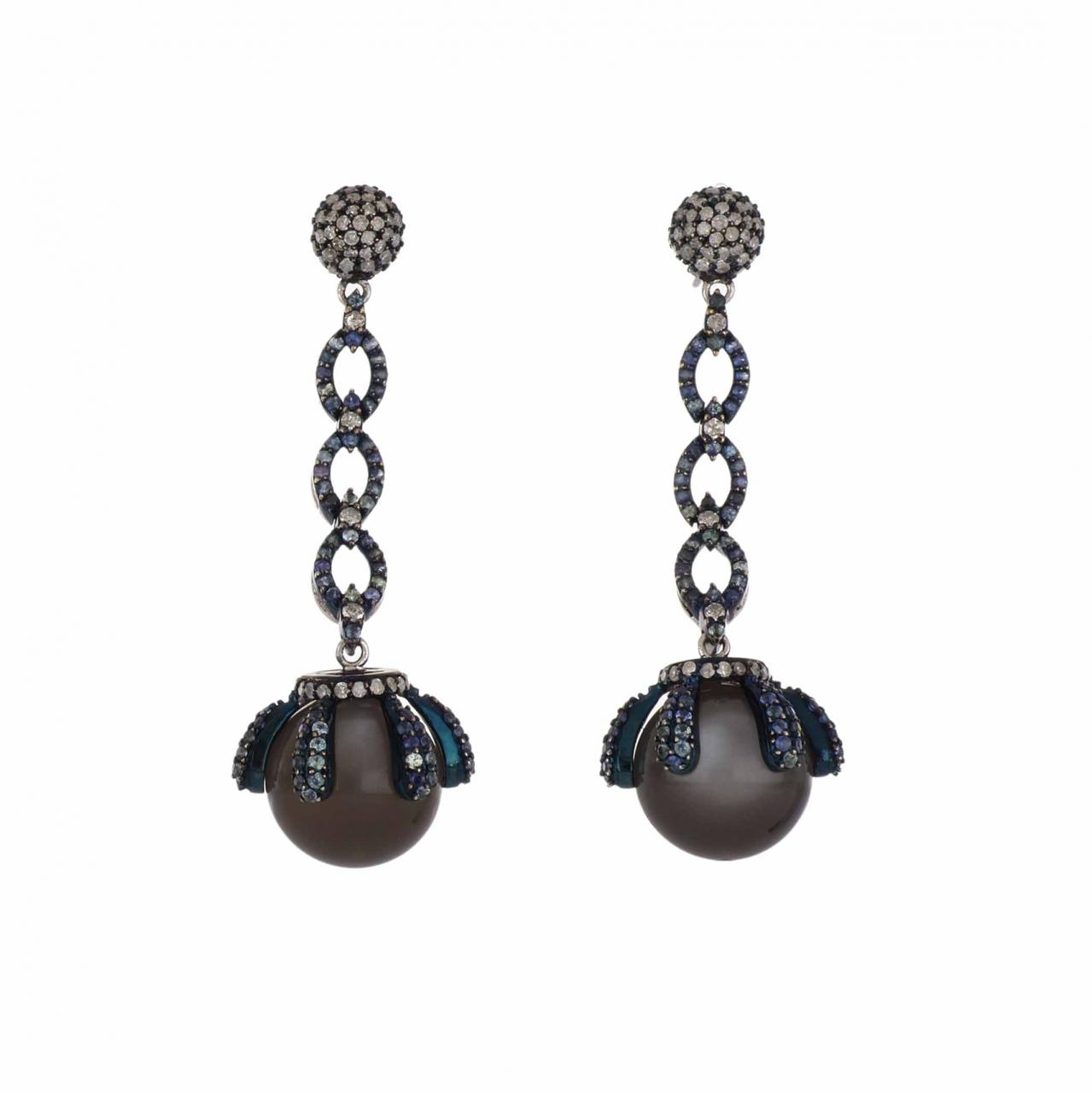 An estate sapphire and diamond drop earrings with moonstone bead terminals, set in sterling silver and 14K white gold . Circa 2010