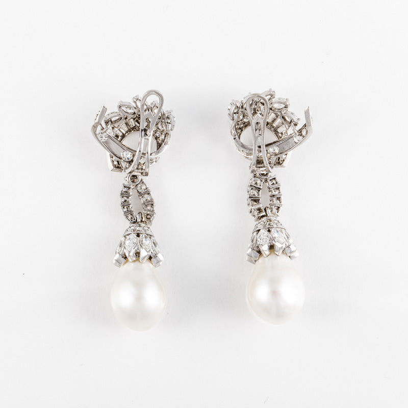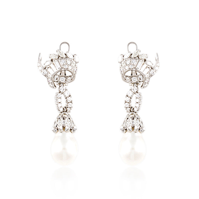 An estate pair of South-Sea pearl and diamond drop earrings in platinum.