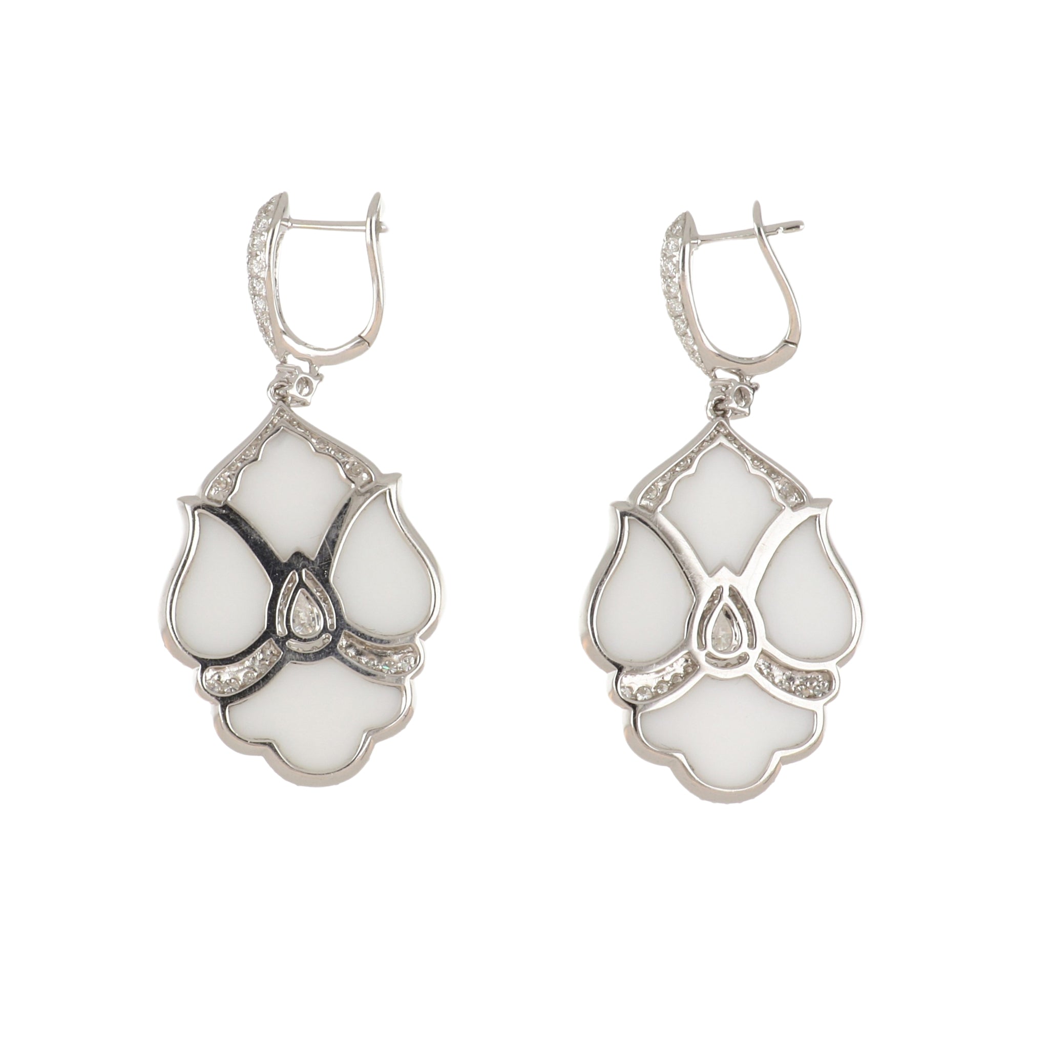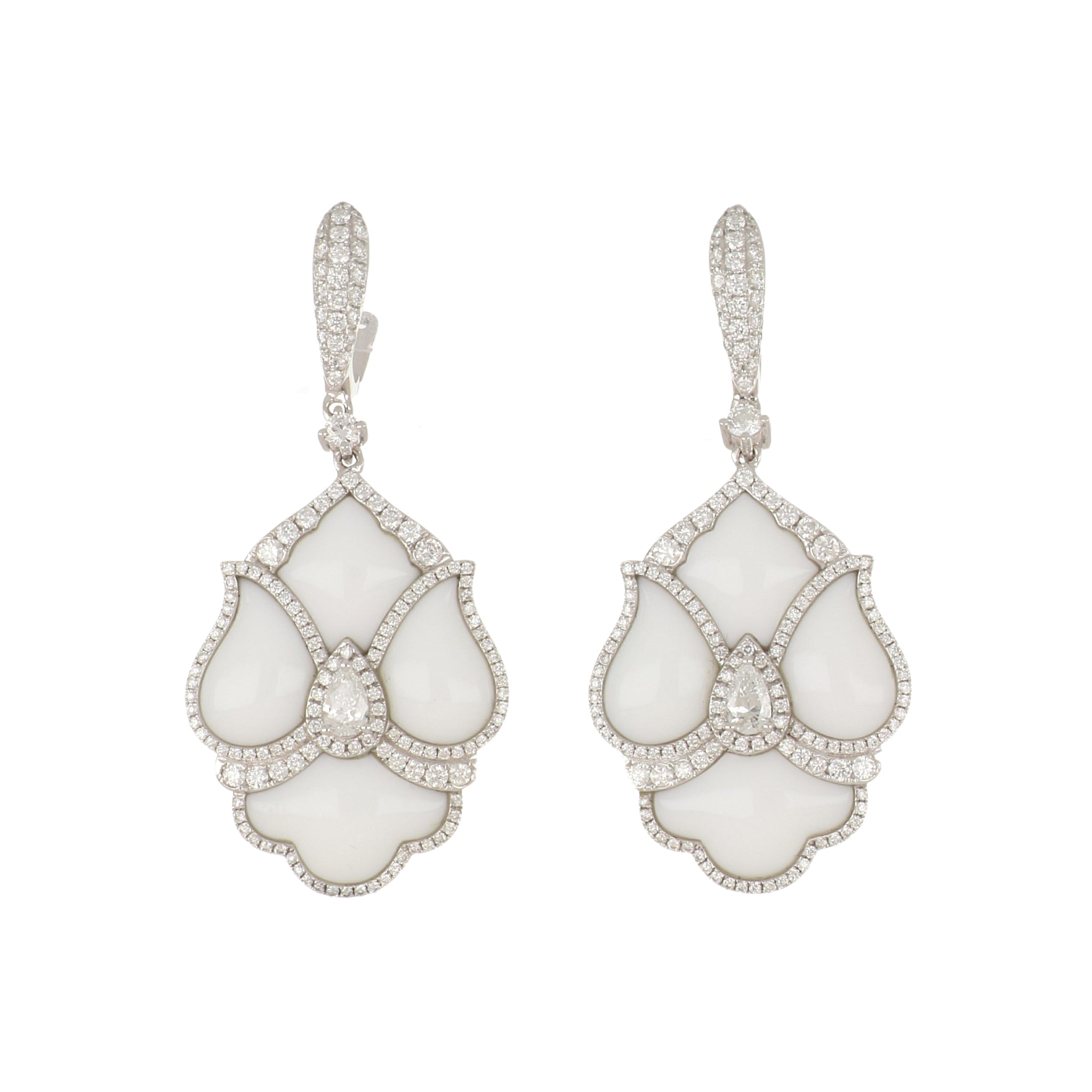 A pair of estate carved white agate pansy earrings set with numerous round and pear brilliant-cut diamonds in 18K white gold.