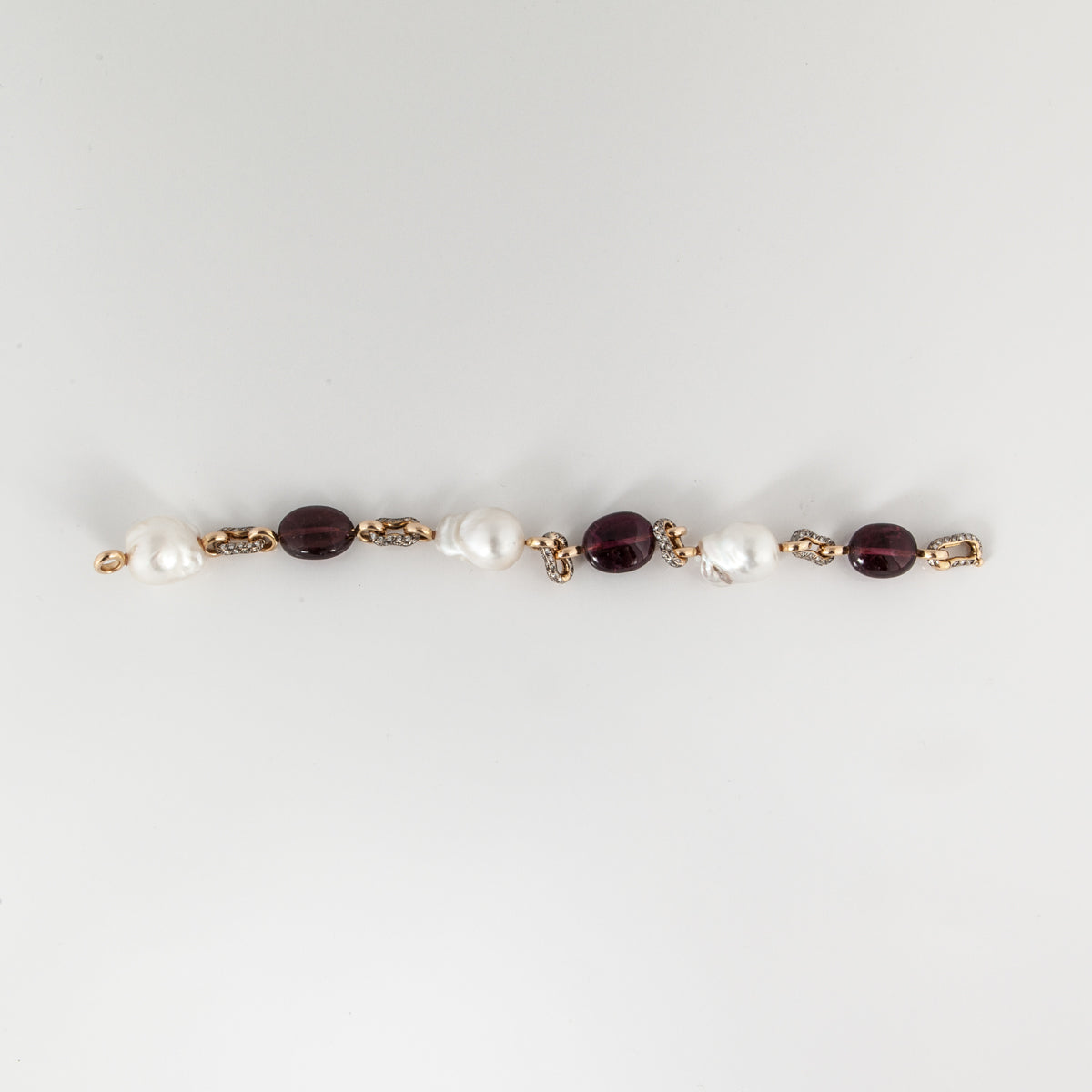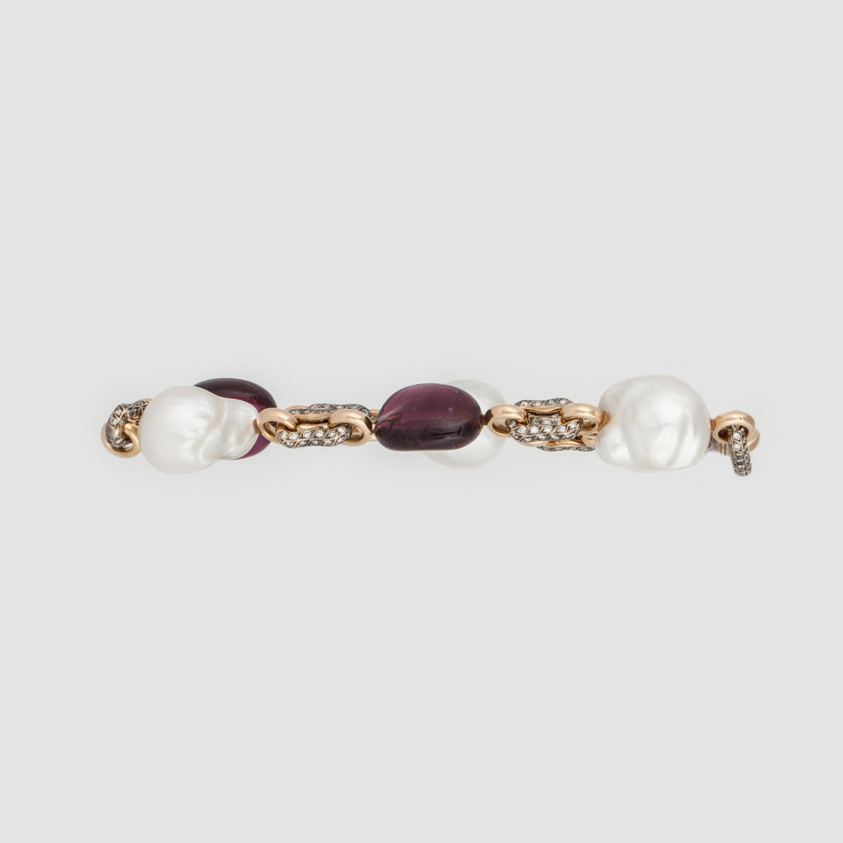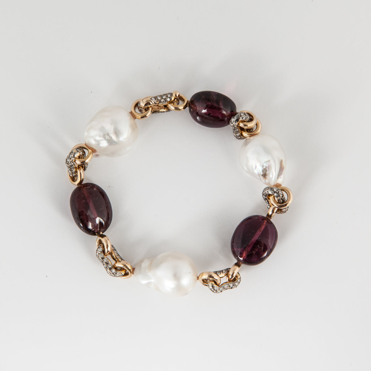 An estate Zorab pink tourmaline pebble and South Sea baroque pearl bracelet with round-cut diamond accents, set in 18K yellow gold. Circa 2000.
