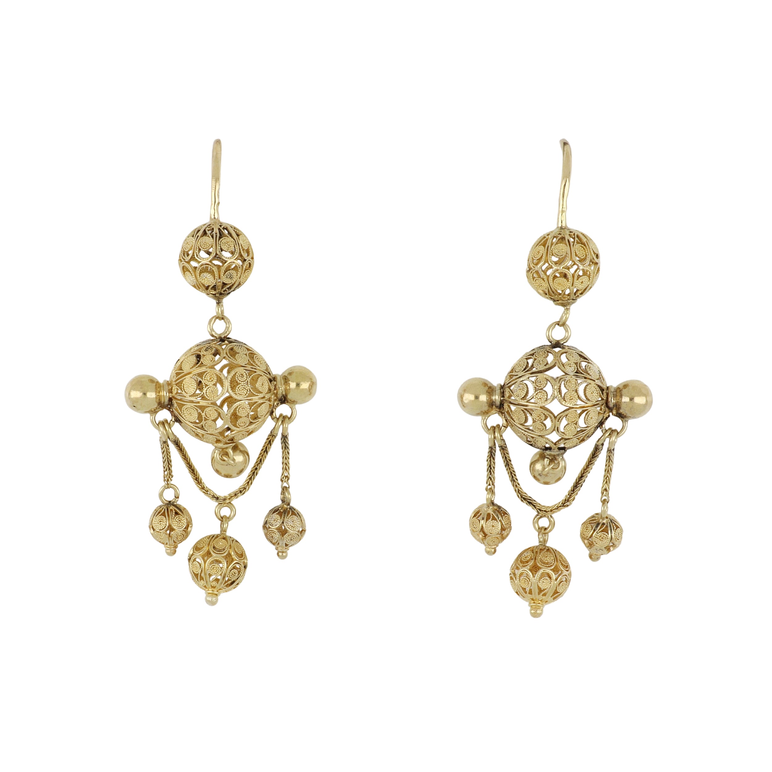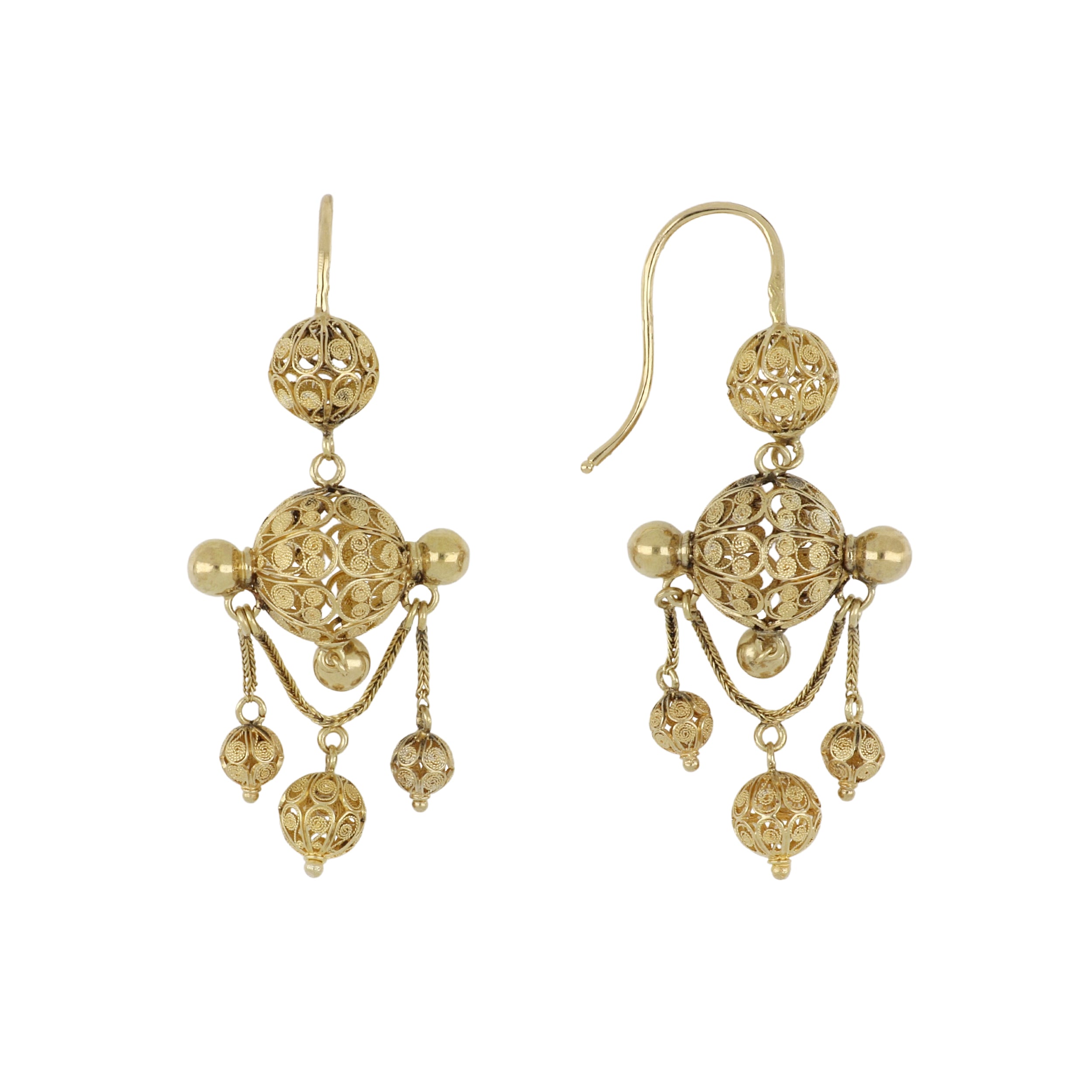 A pair of French Georgian (Louis-Philippe) cannetille drop ball earrings in 18K yellow gold. French, circa 1830.