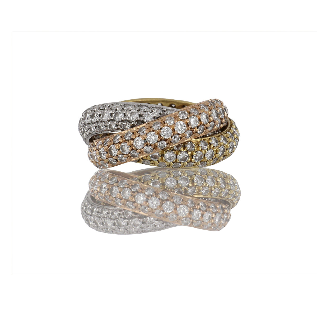An estate Garavelli 18K yellow, white, and rose gold pave diamond triple rolling ring. Circa 2010.