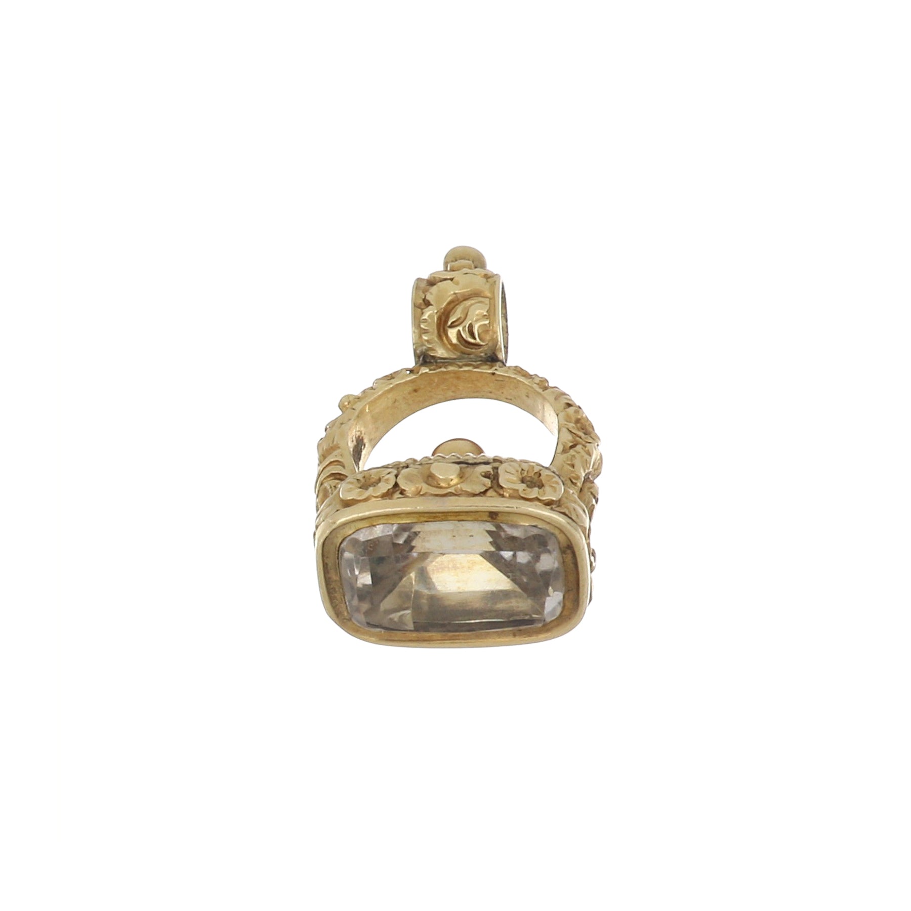 A Georgian fob with intricate carvings and an elongated mixed-cut citrine, set in 14K yellow gold. Circa 1800.
