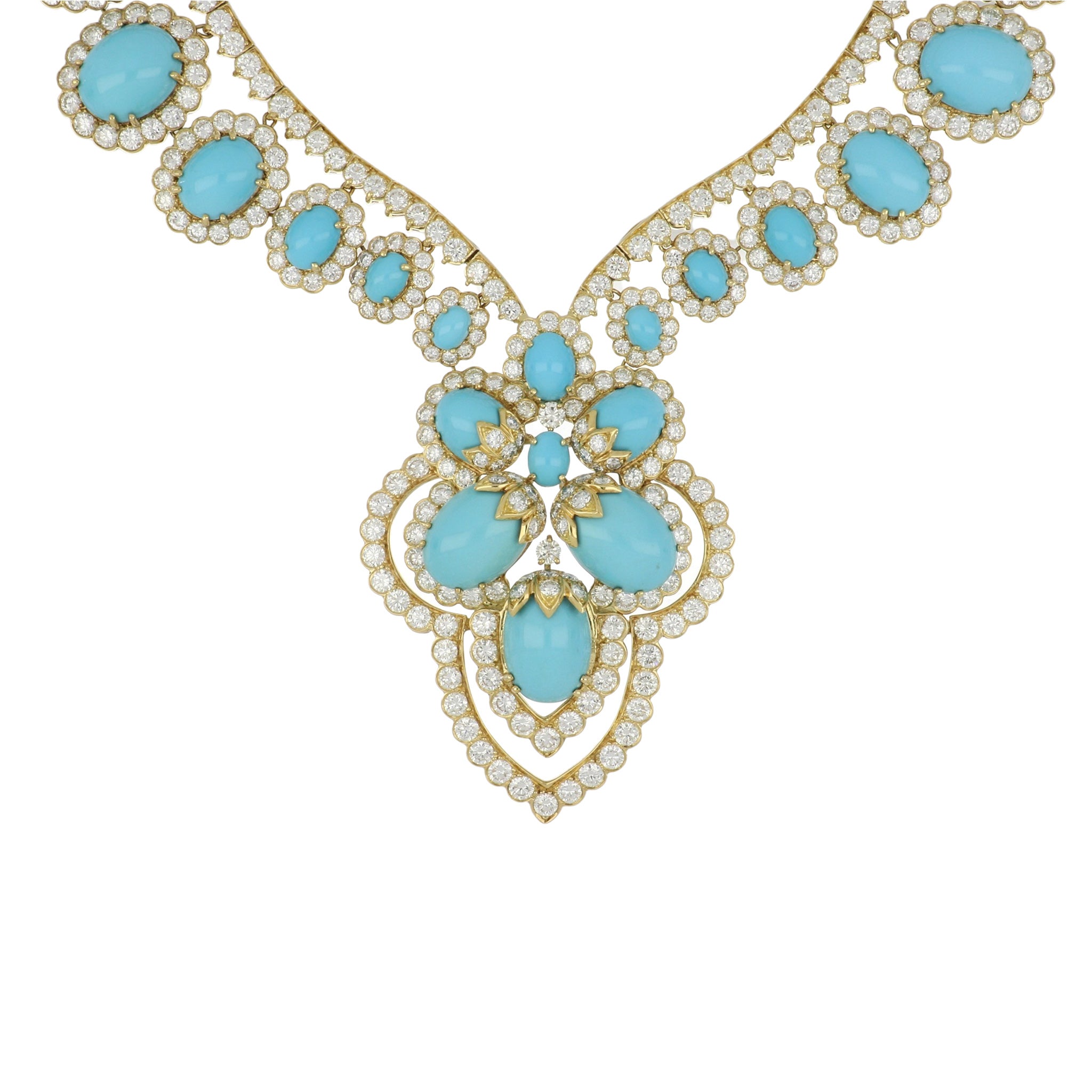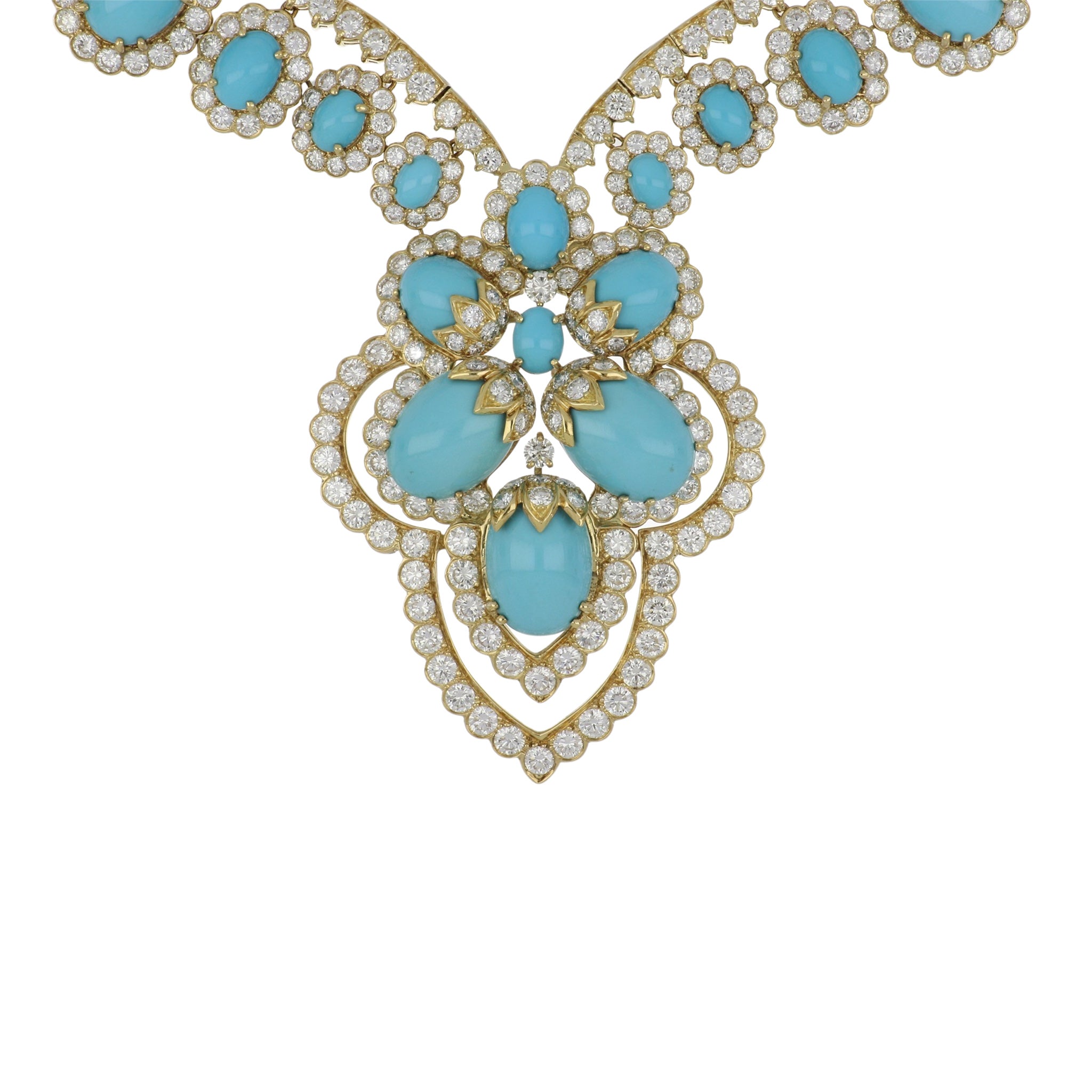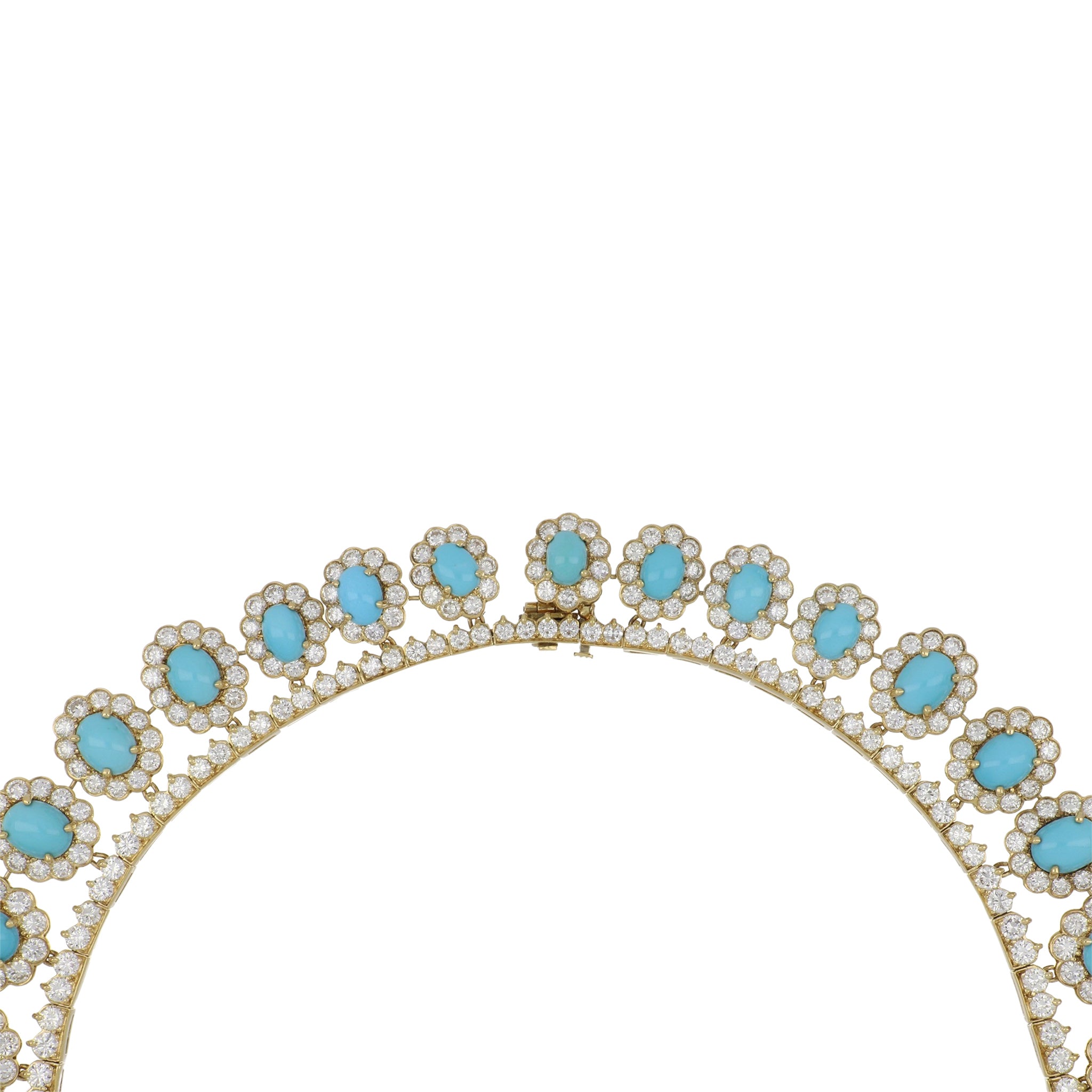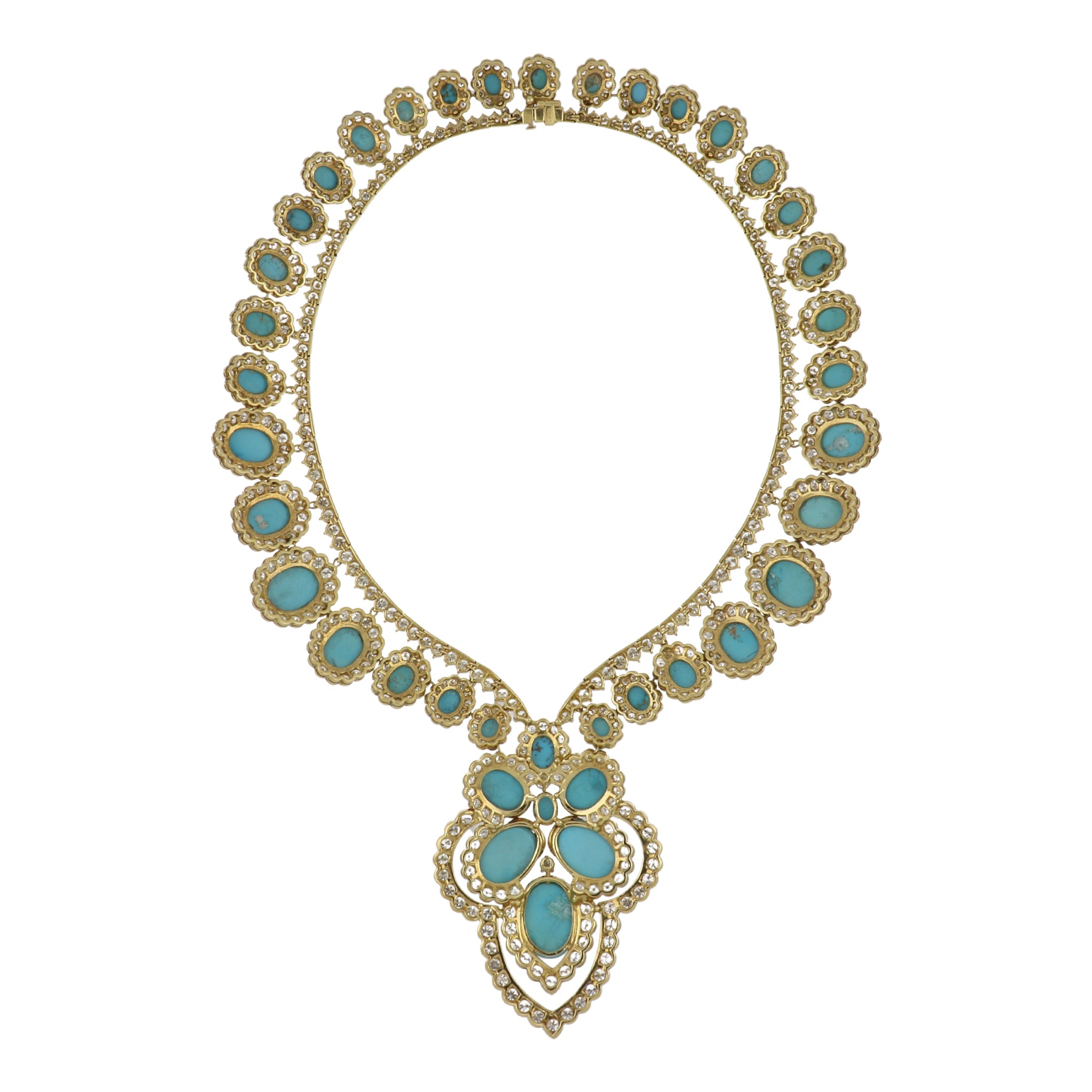 An estate important turquoise and diamond jewelry suite featuring a bib necklace, bracelet and drop earrings set in 18K yellow gold. Signed: Emis.