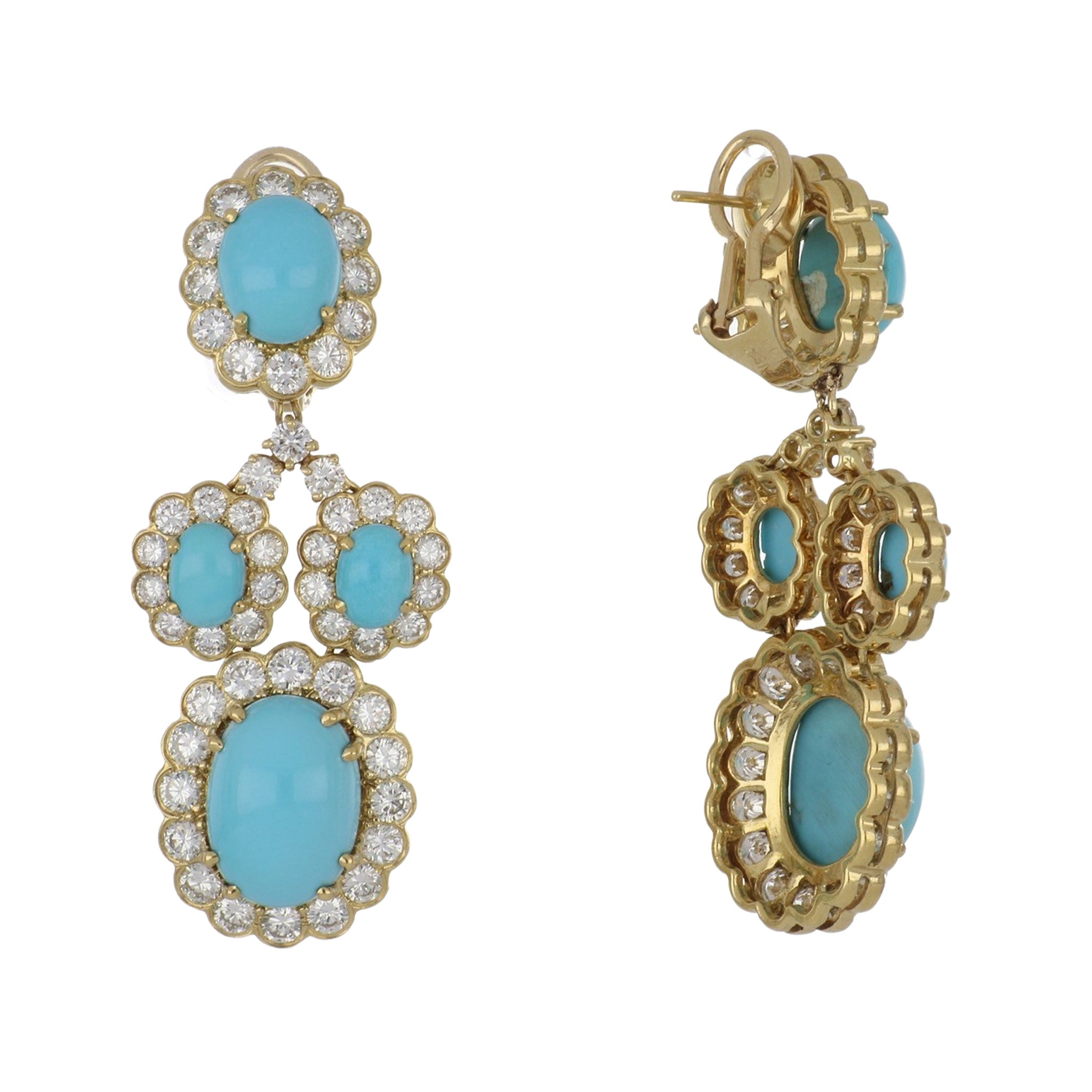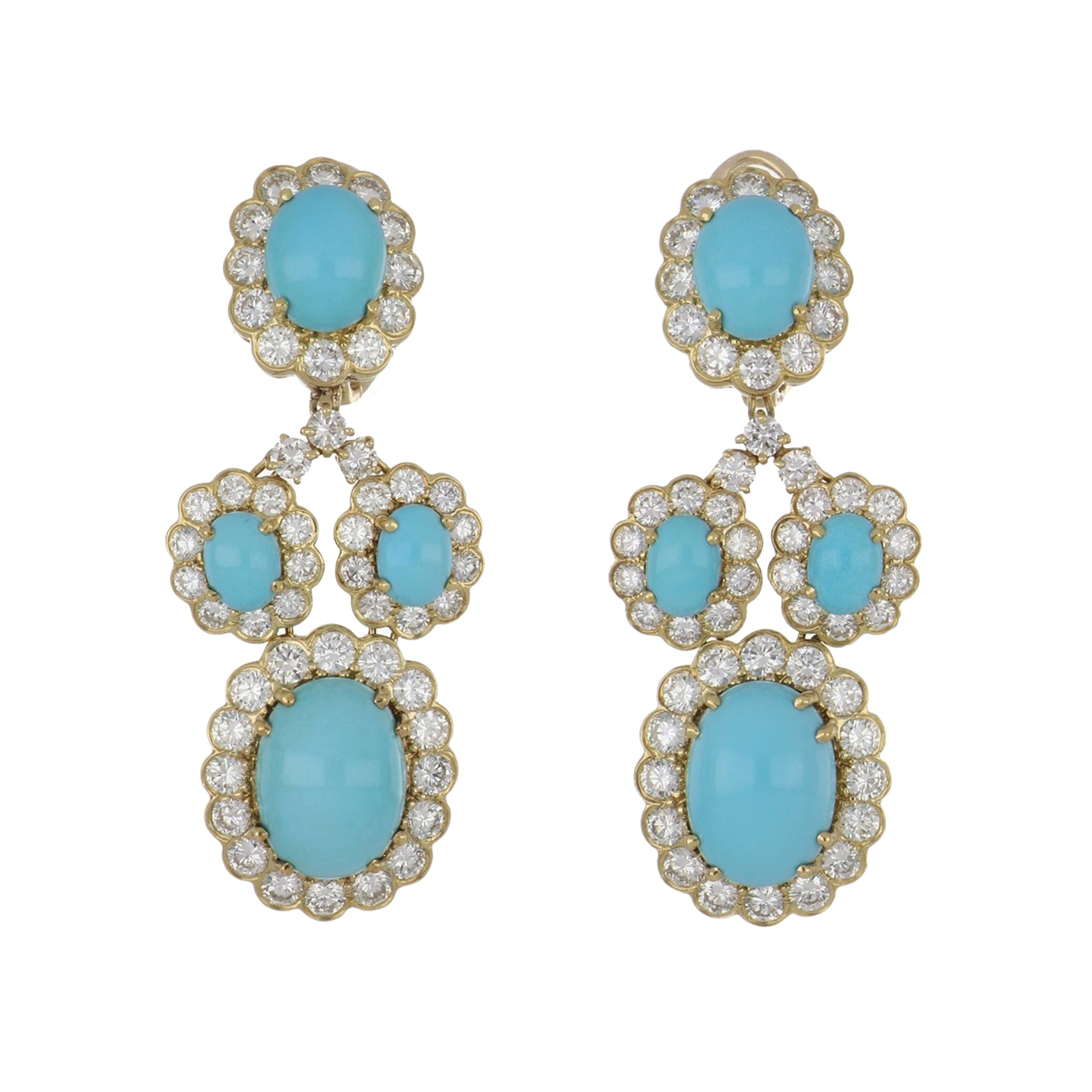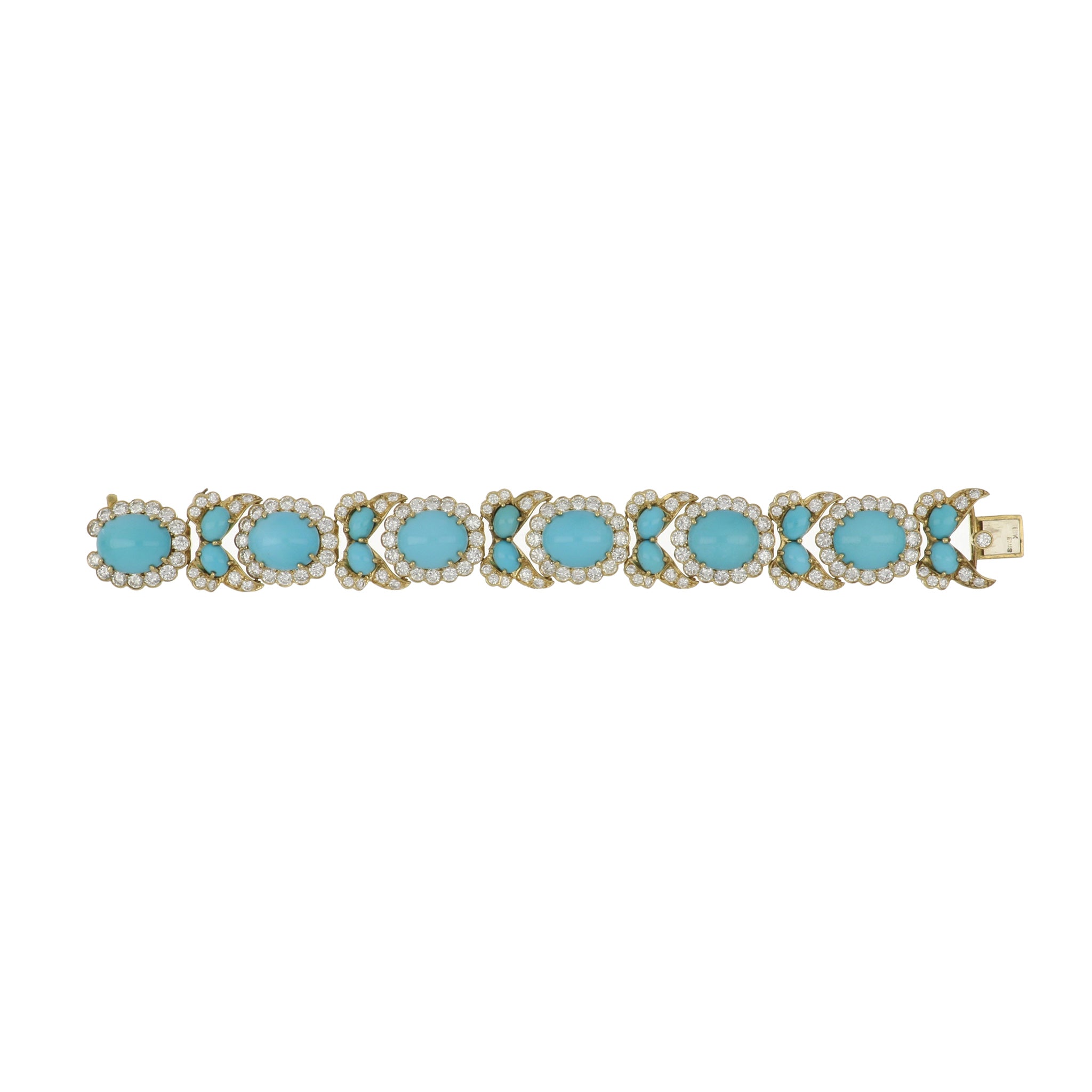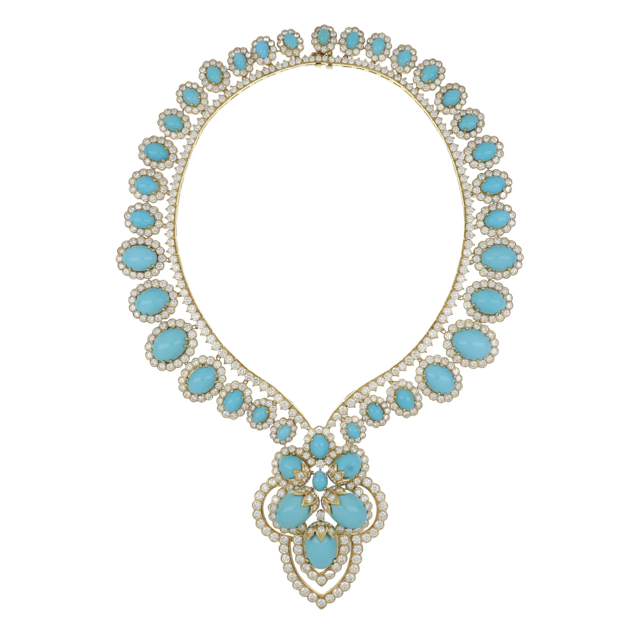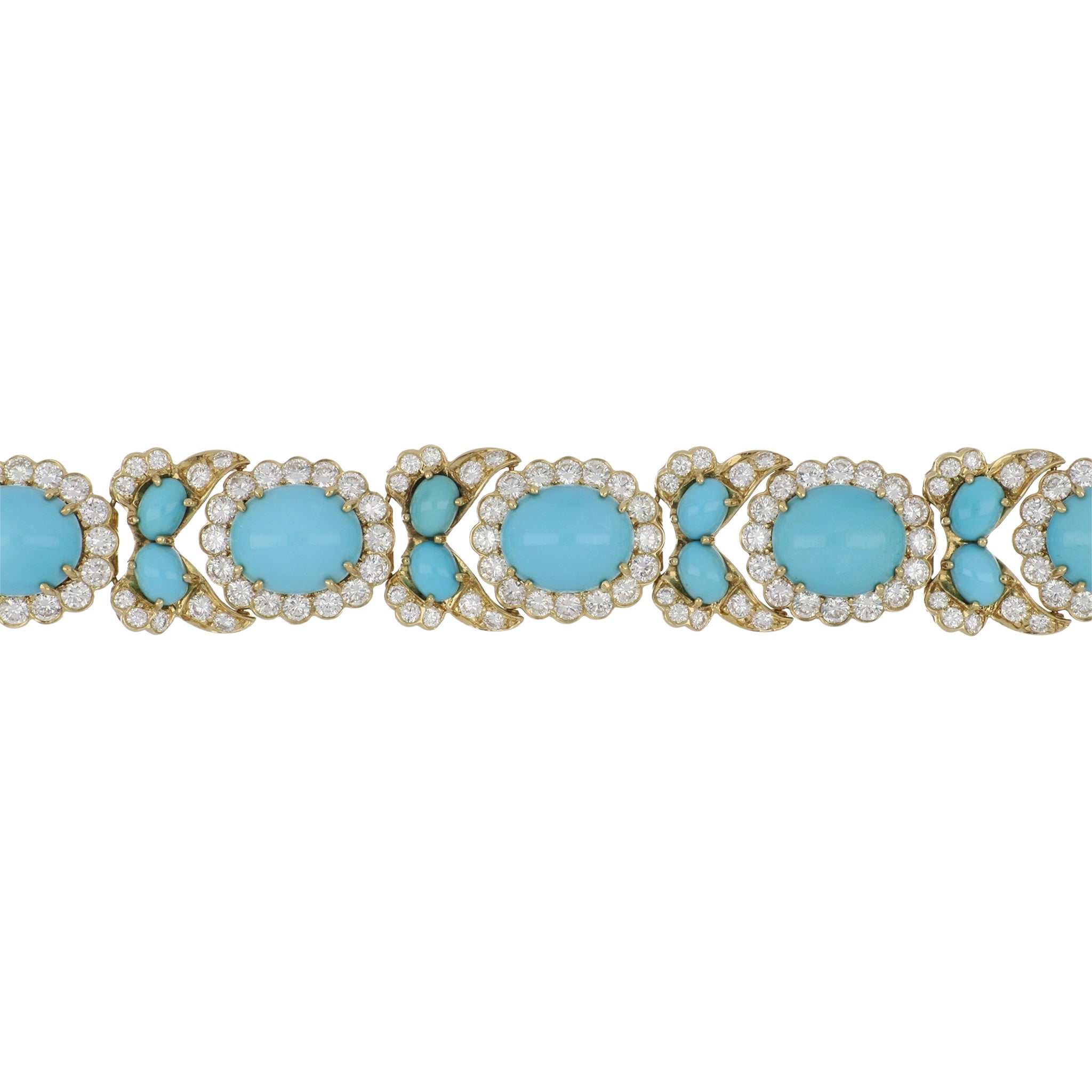 An estate important turquoise and diamond jewelry suite featuring a bib necklace, bracelet and drop earrings set in 18K yellow gold. Signed: Emis.