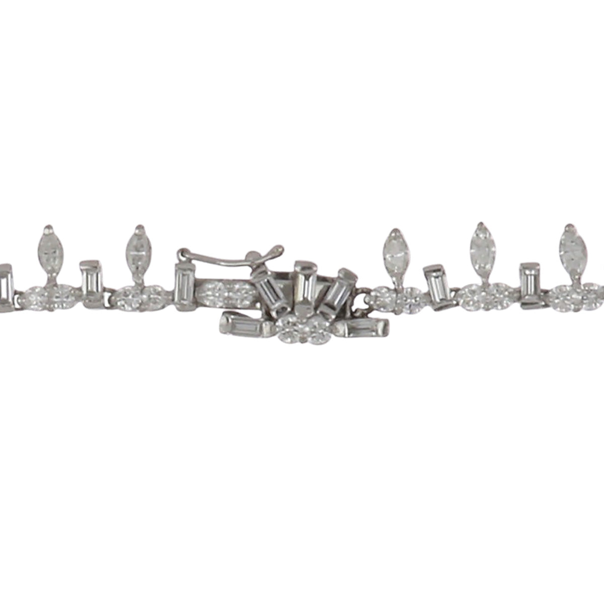 An important Mid-Century garland-style fringe necklace with graduated baguette and round brilliant-cut diamond links supporting numerous fancy-shape diamond drops, set in platinum. Circa 1960.