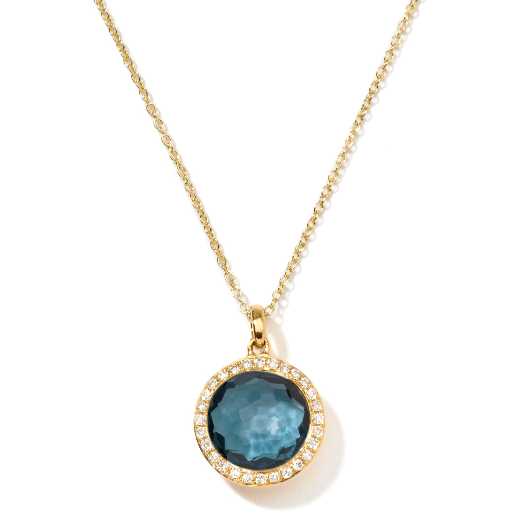An Ippolita Lollipop mini pendant necklace in London blue topaz with diamonds, set in 18K yellow gold.