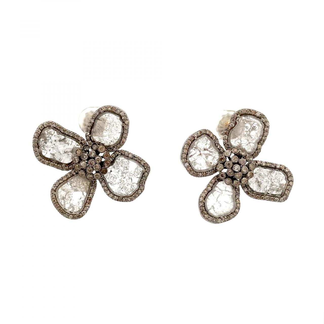 A new pair of Maharaja diamond slice flower earrings with round diamond borders, set in sterling silver.