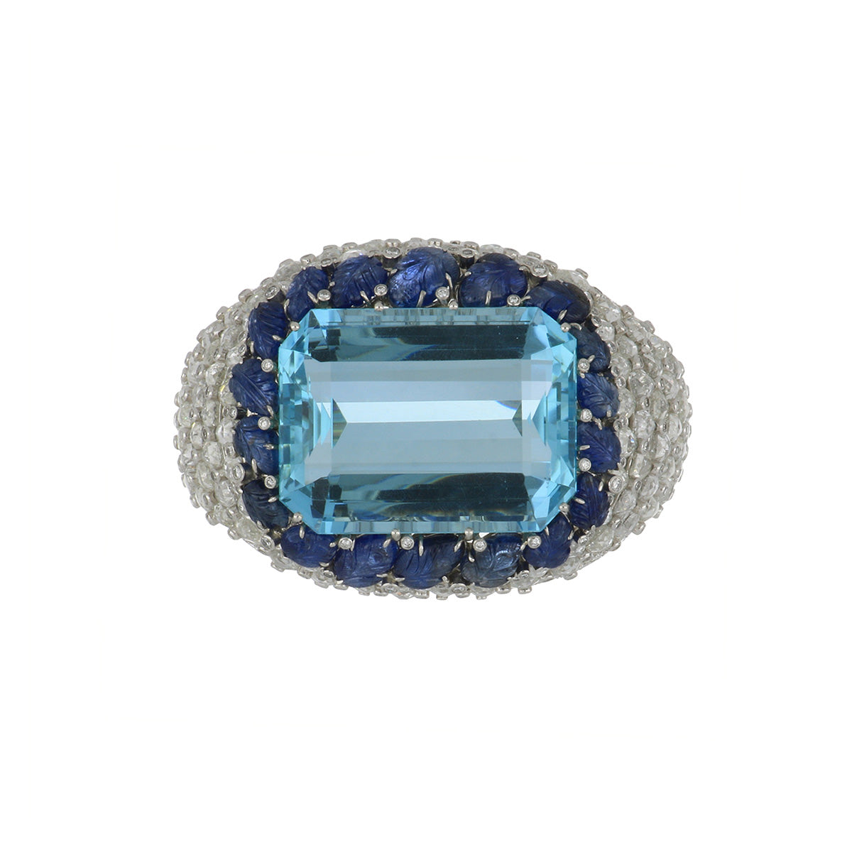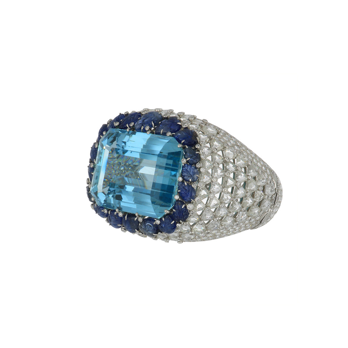 An estate David Webb Couture Masterpiece cuff bracelet, finished in 18K white gold and platinum with a rectangular shape aquamarine centerpiece, carved "leaf" sapphire border and detailed round brilliant-cut diamond latticework.