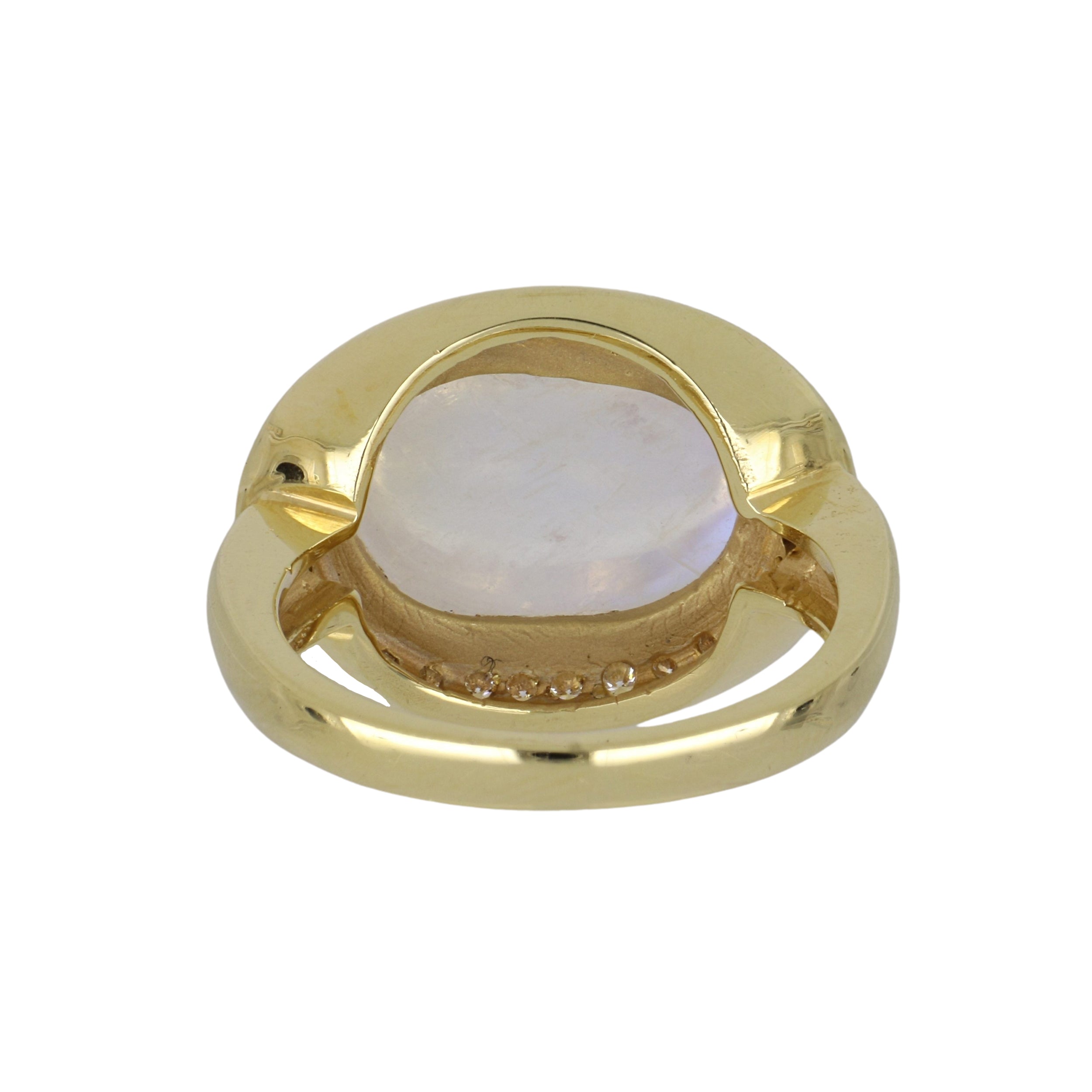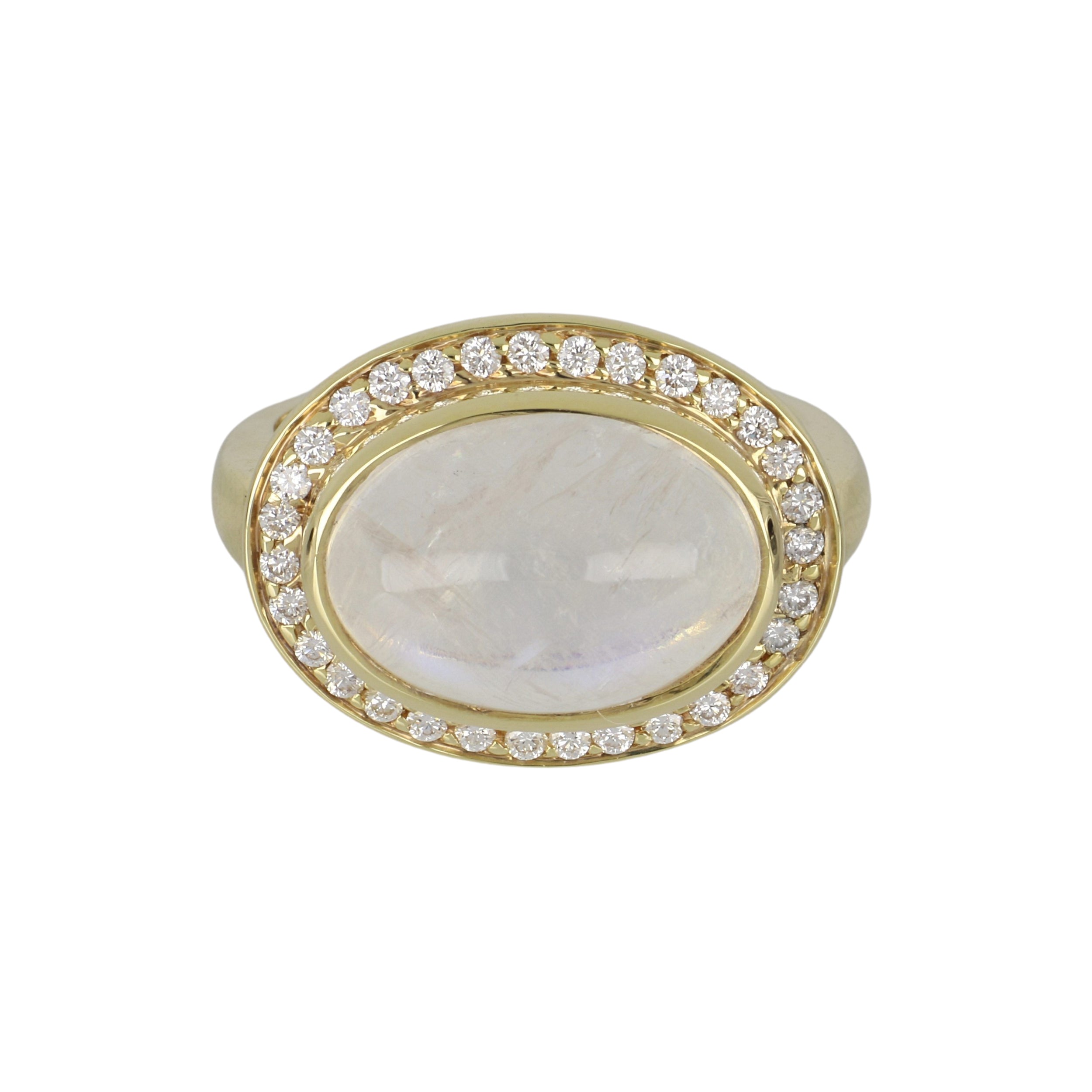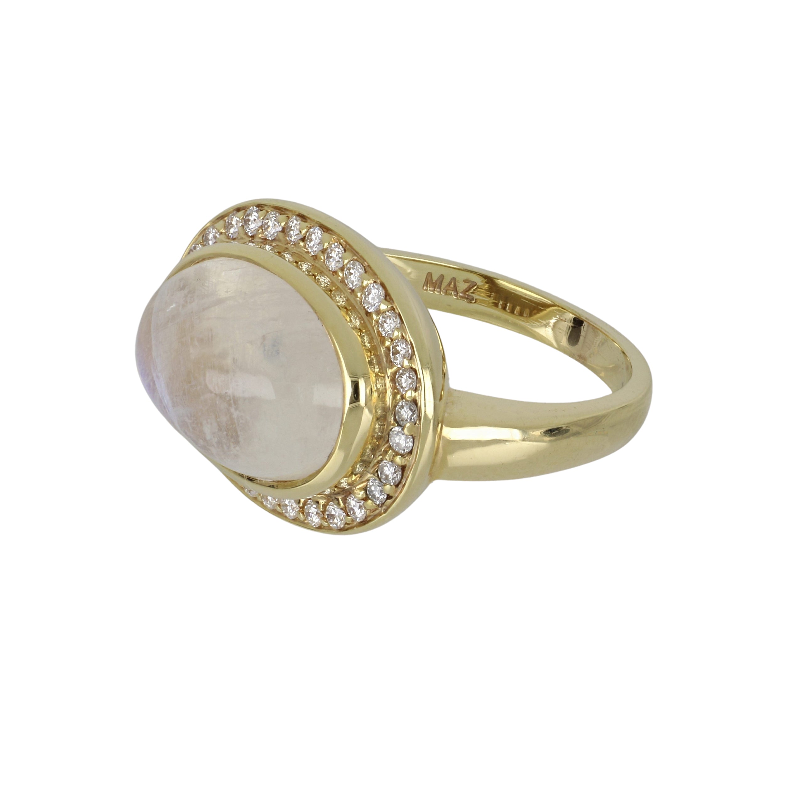 A Mazza moonstone ring with a diamond border, set in 14k yellow gold.