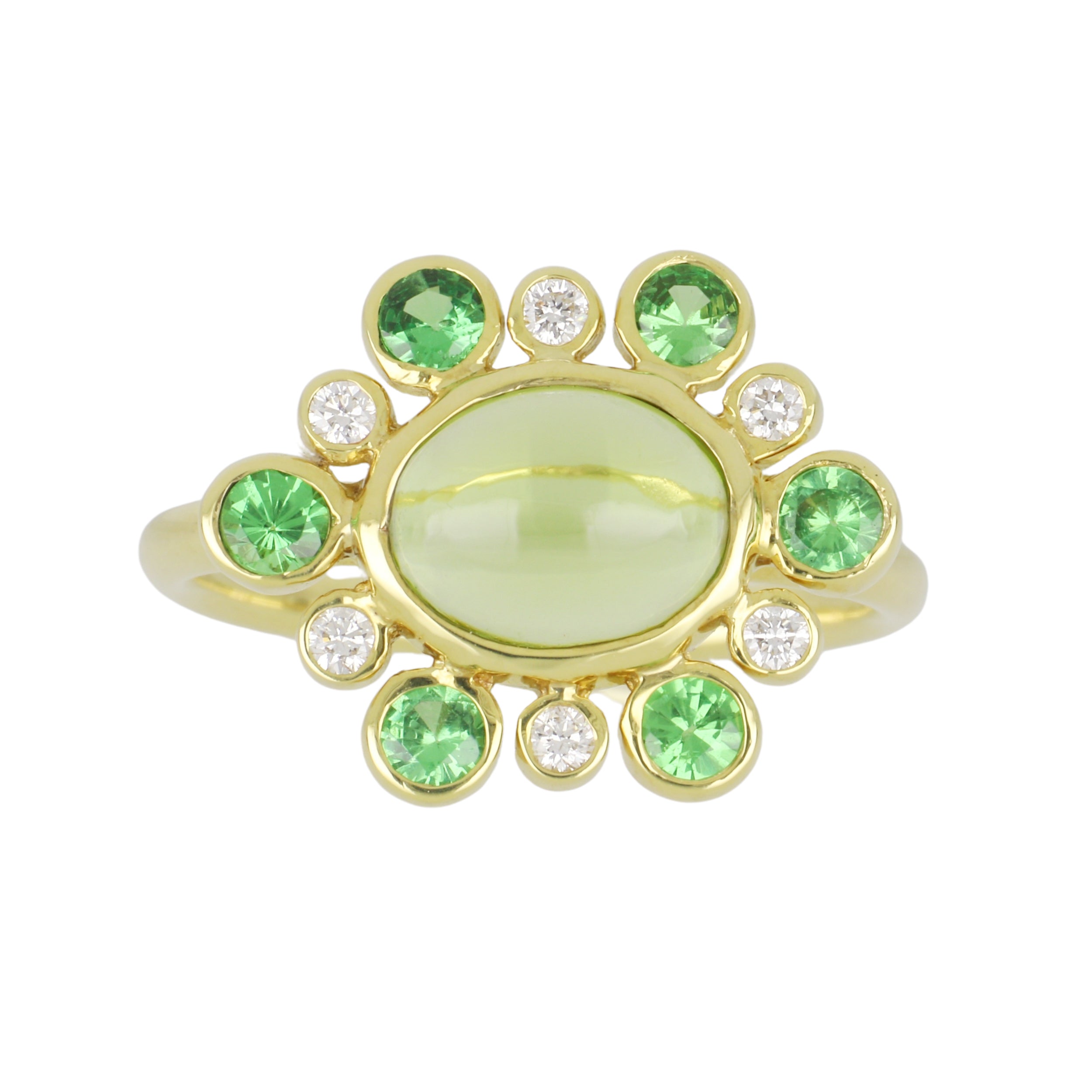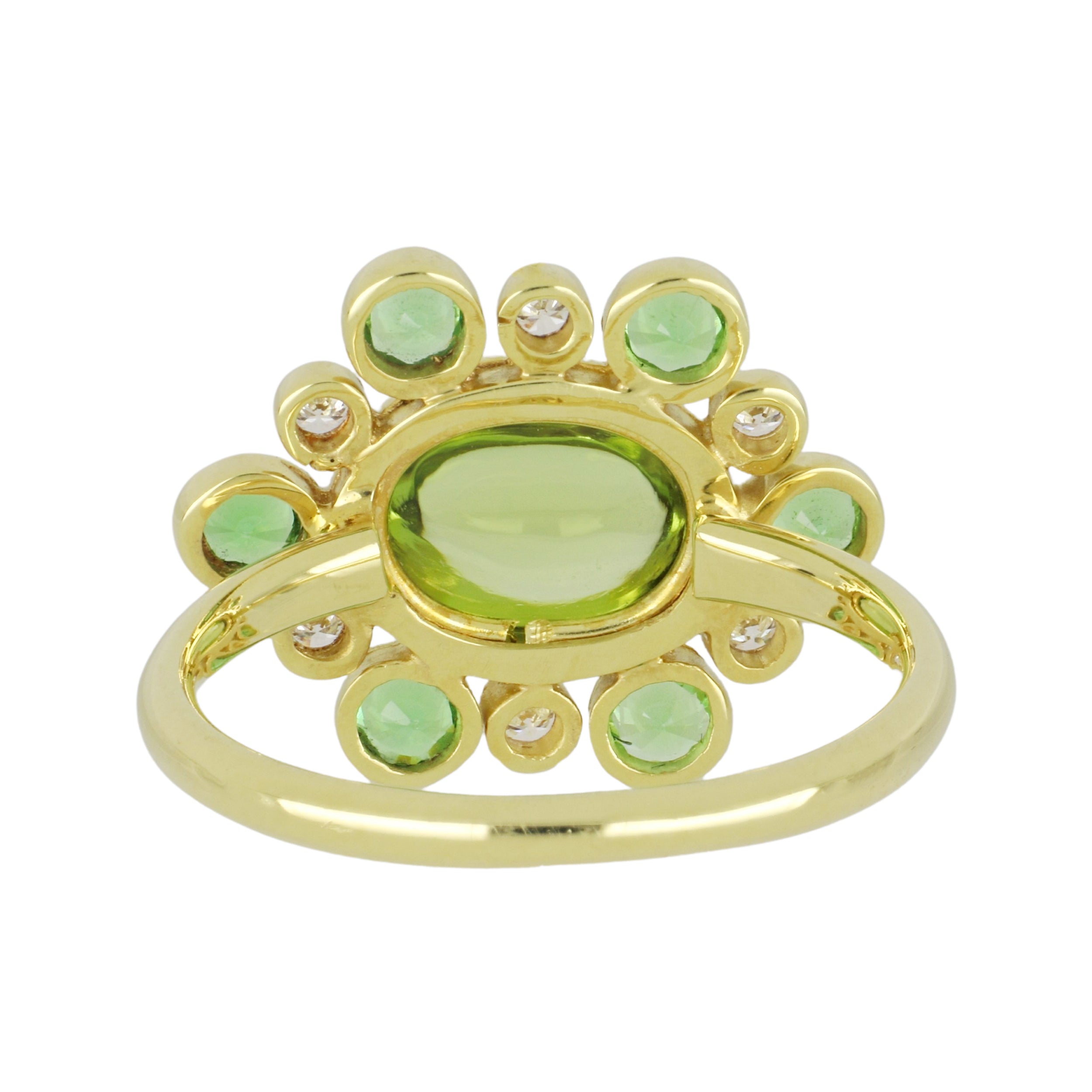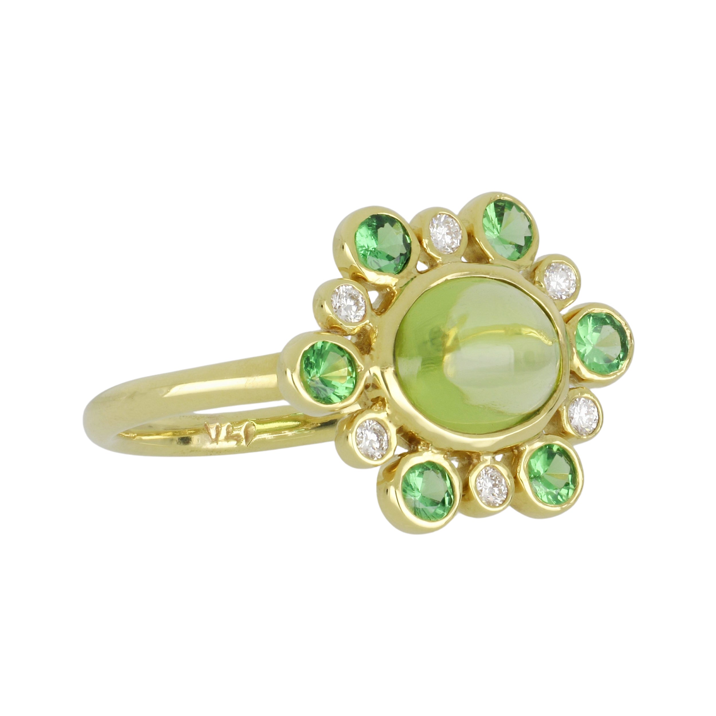 A Mazza ring featuring a cabochon peridot accented by tsavorite garnets and diamonds, set in 14K yellow gold.